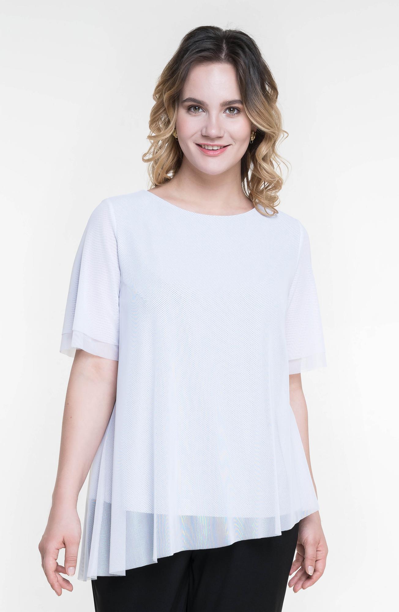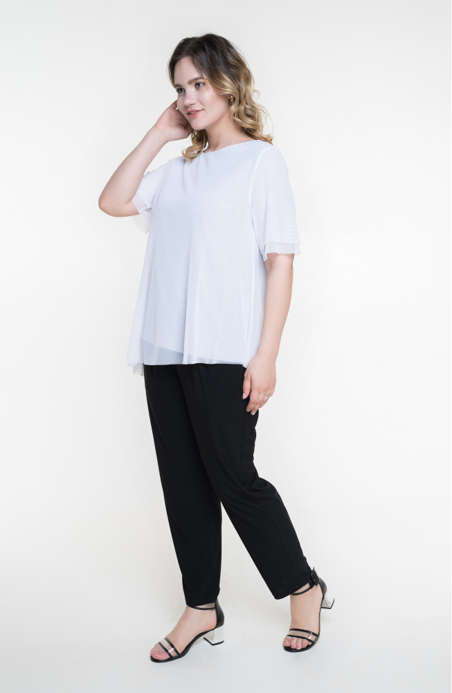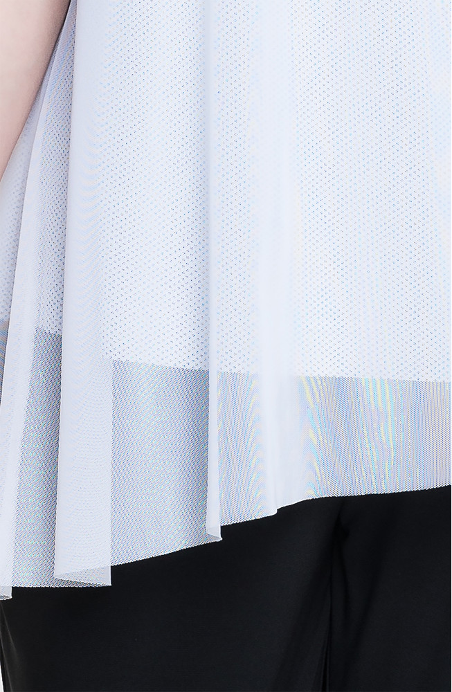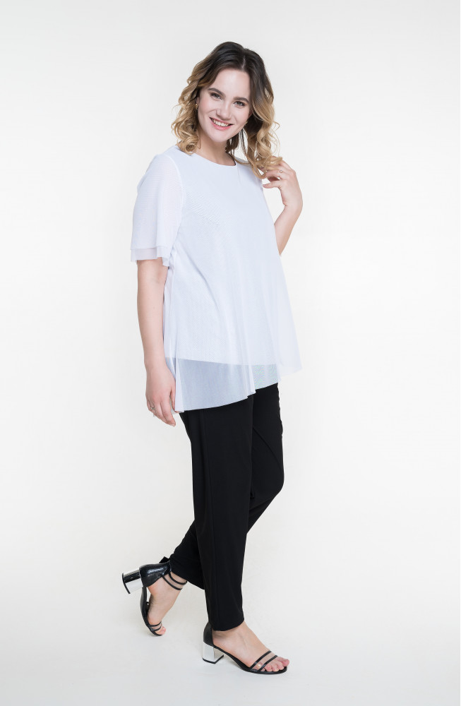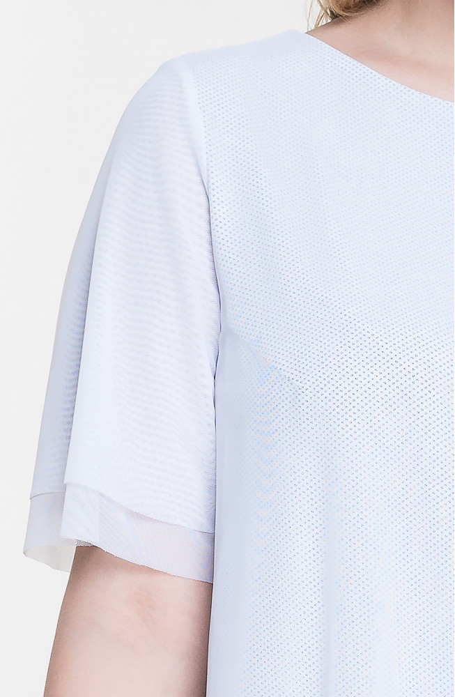 Описание: Джемпер удлиненный из трикотажной сетки с подкладкой из тонкого вискозного трикотажа трапецевидного силуэта со скошенной линией низа. Рукава короткие двуслойные из сетки.