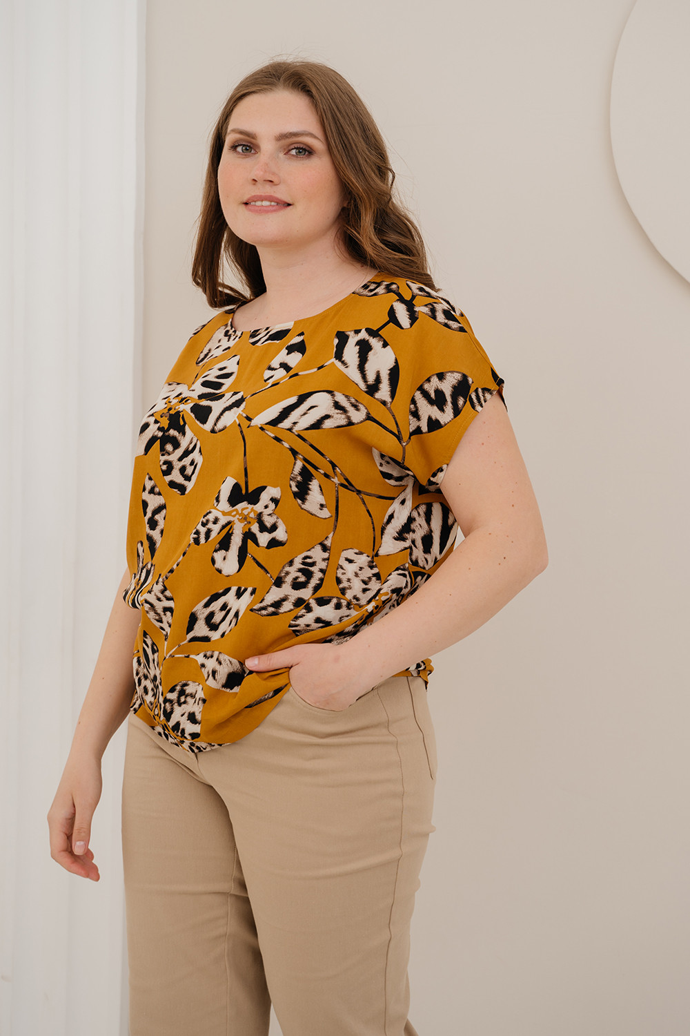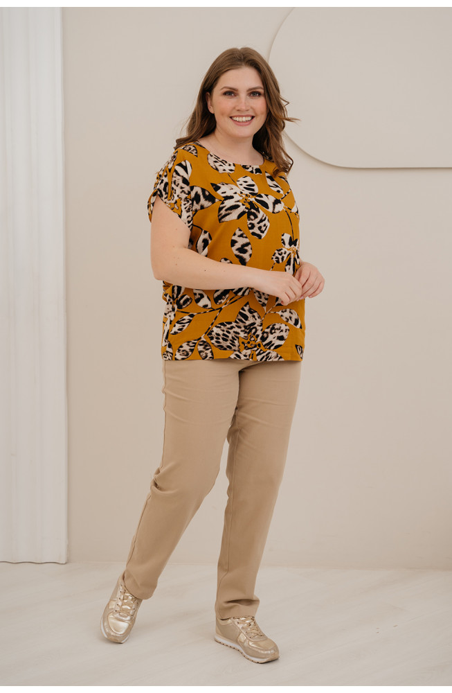 Описание: Джемпер удлиненый прямого силуэта с округлым вырезом горловины и спущенной линией плеча из вискозной ткани "штапель"с абстрактным принтом.