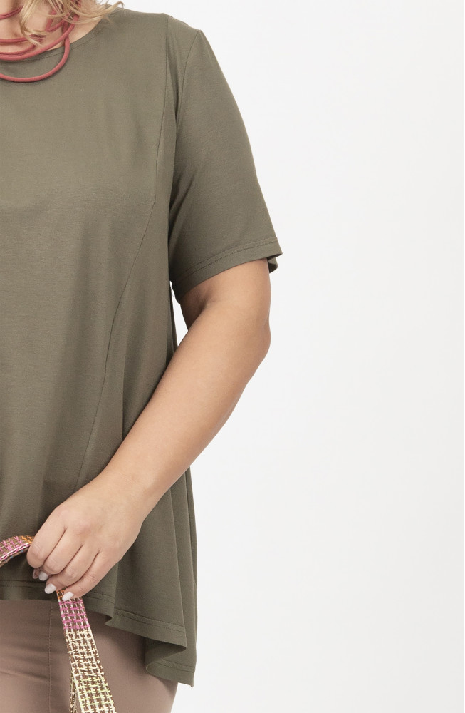 Описание: Джемпер из тонкого вискозного трикотажа трапецевидного силуэта асимметричного кроя с рельефом и более расширенной левой частью.