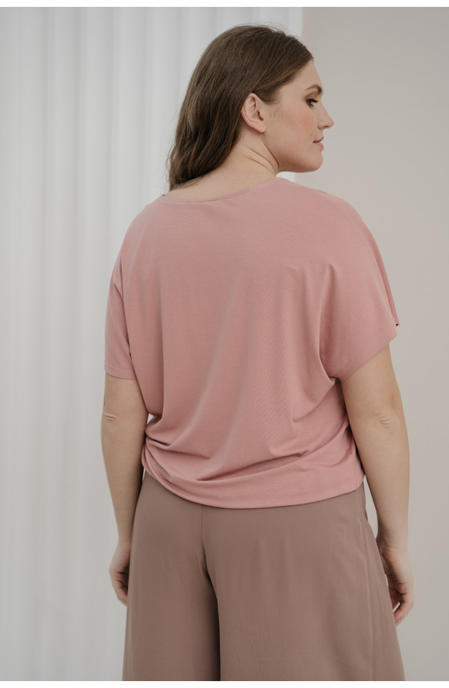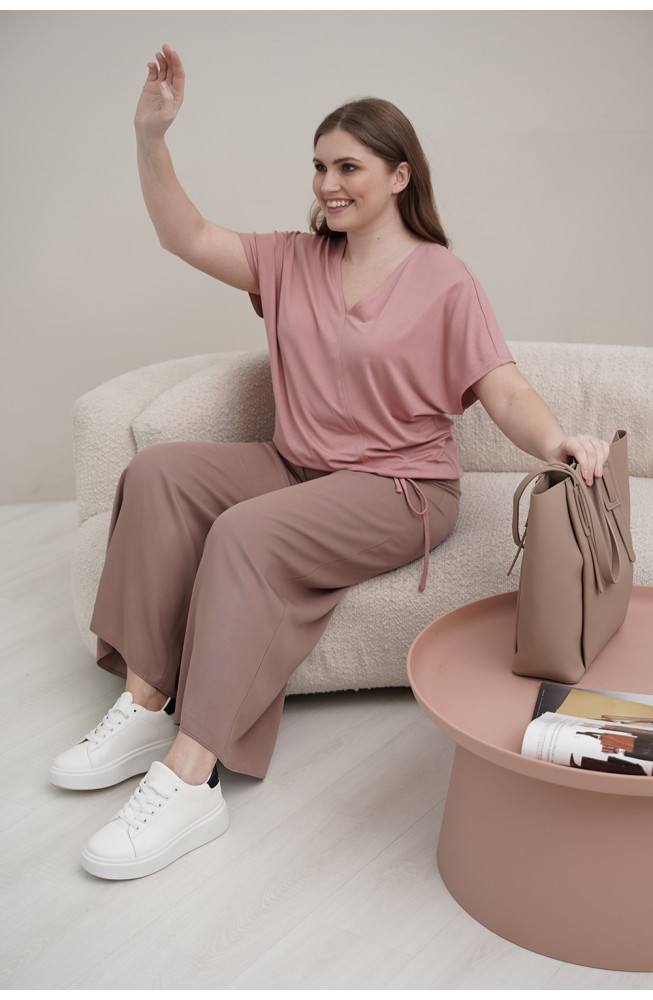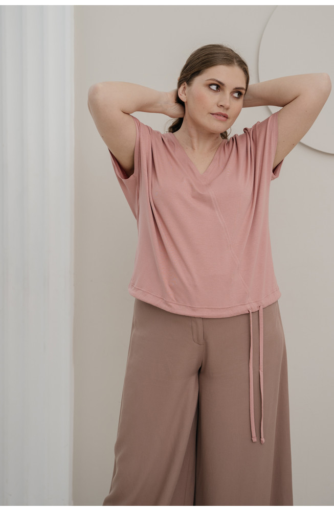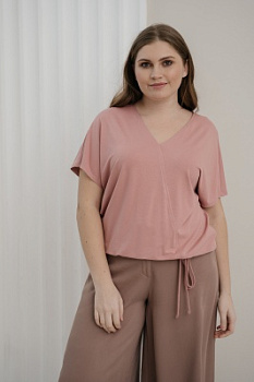 Описание: Джемпер из тонкого вискозного трикотажа с V-образным вырезом горловины с имитацией запаха, со спущенным плечом без рукавов и на кулиске с завязкой по линии низа.