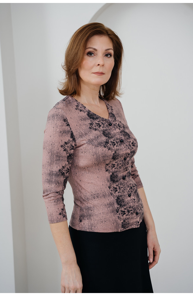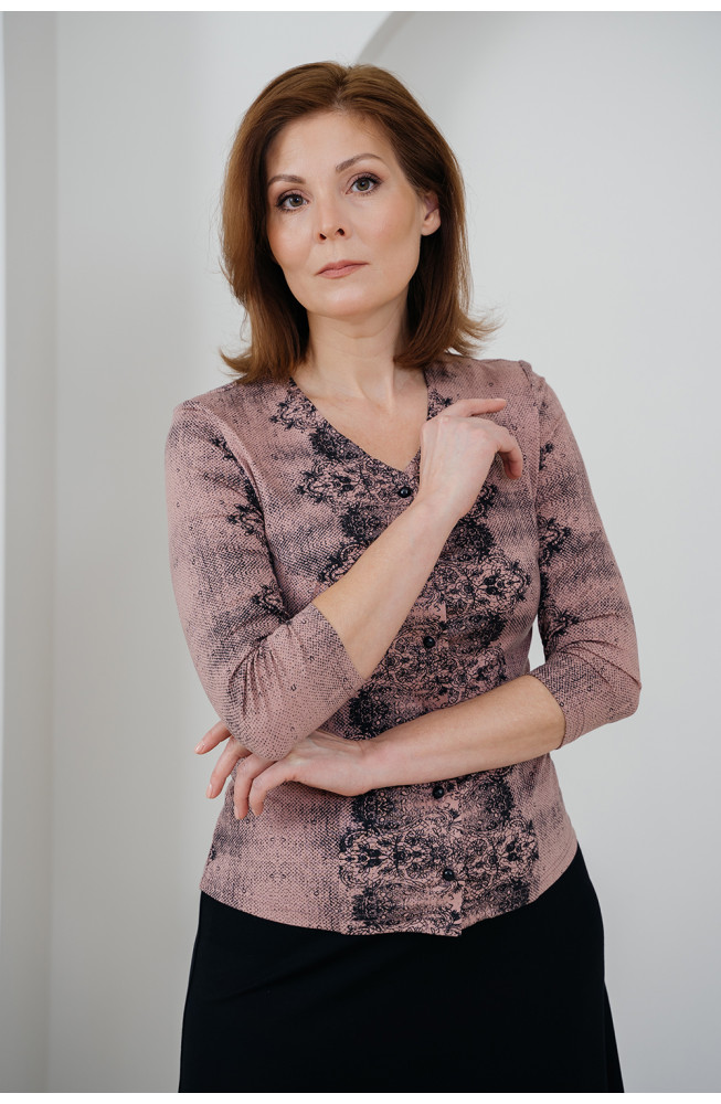 Описание: Блуза из тонкого вискозного трикотажа приталенного силуэта на пуговицах с V-образным вырезом горловины и рукавами длиной 3/4.