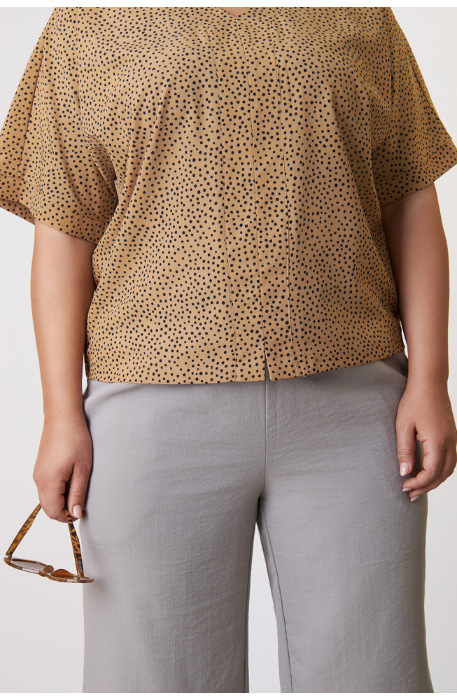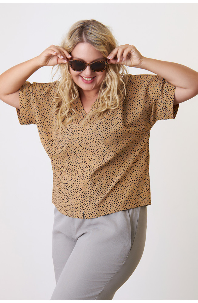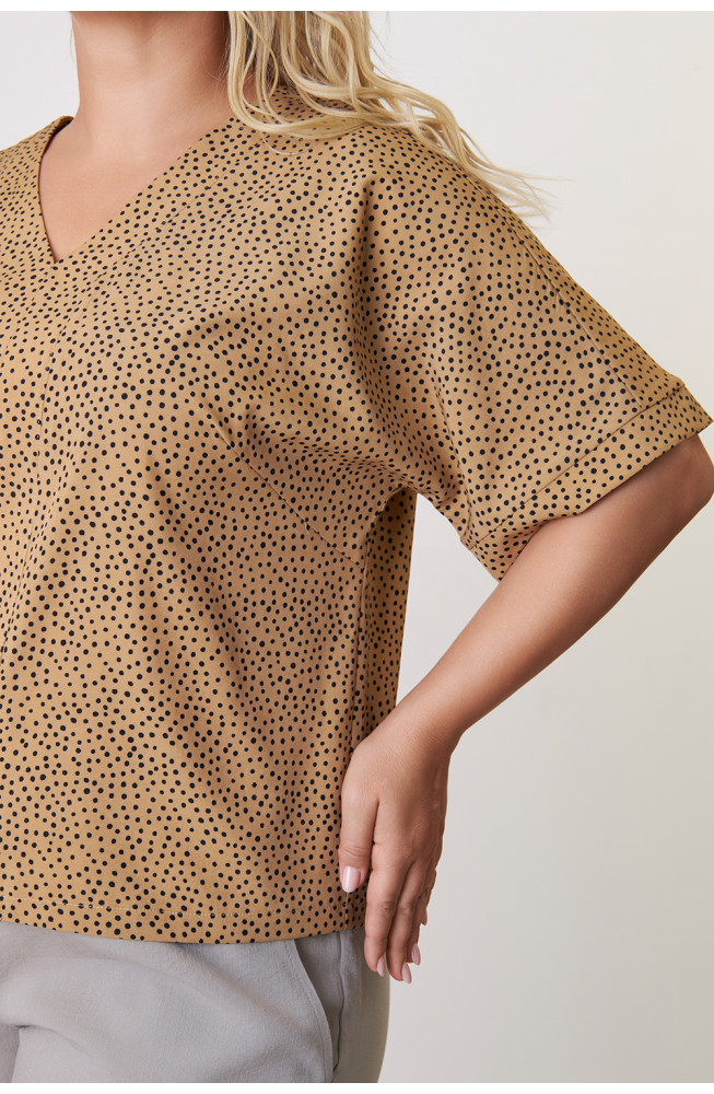 Описание: Блузка свободного силуэта с V-образным вырезом горловины, с планкой и разрезом по центру переда, рукав короткий цельнокроенный с манжетом.