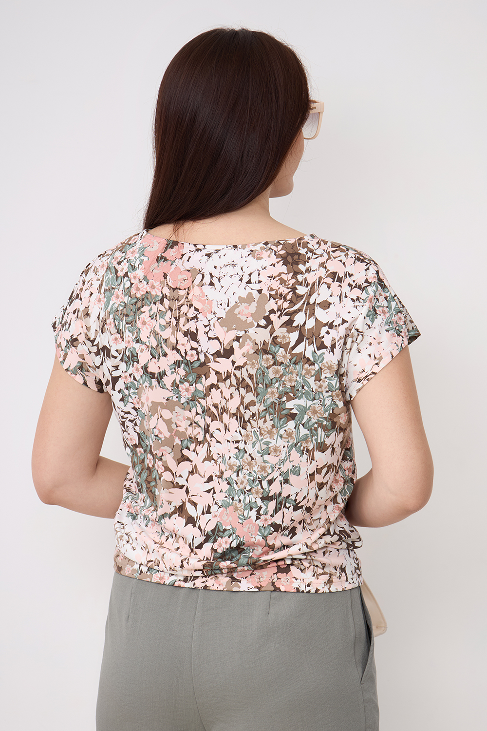Описание: Блузка женская прямого силуэта слегка зауженная по бедрам, имеет короткие цельнокроенные рукава и округлый вырез горловины. Выполнена из тонкого трикотажа с оригинальным принтом, который подчеркнет индивидуальность и добавит яркости в повседневный образ.