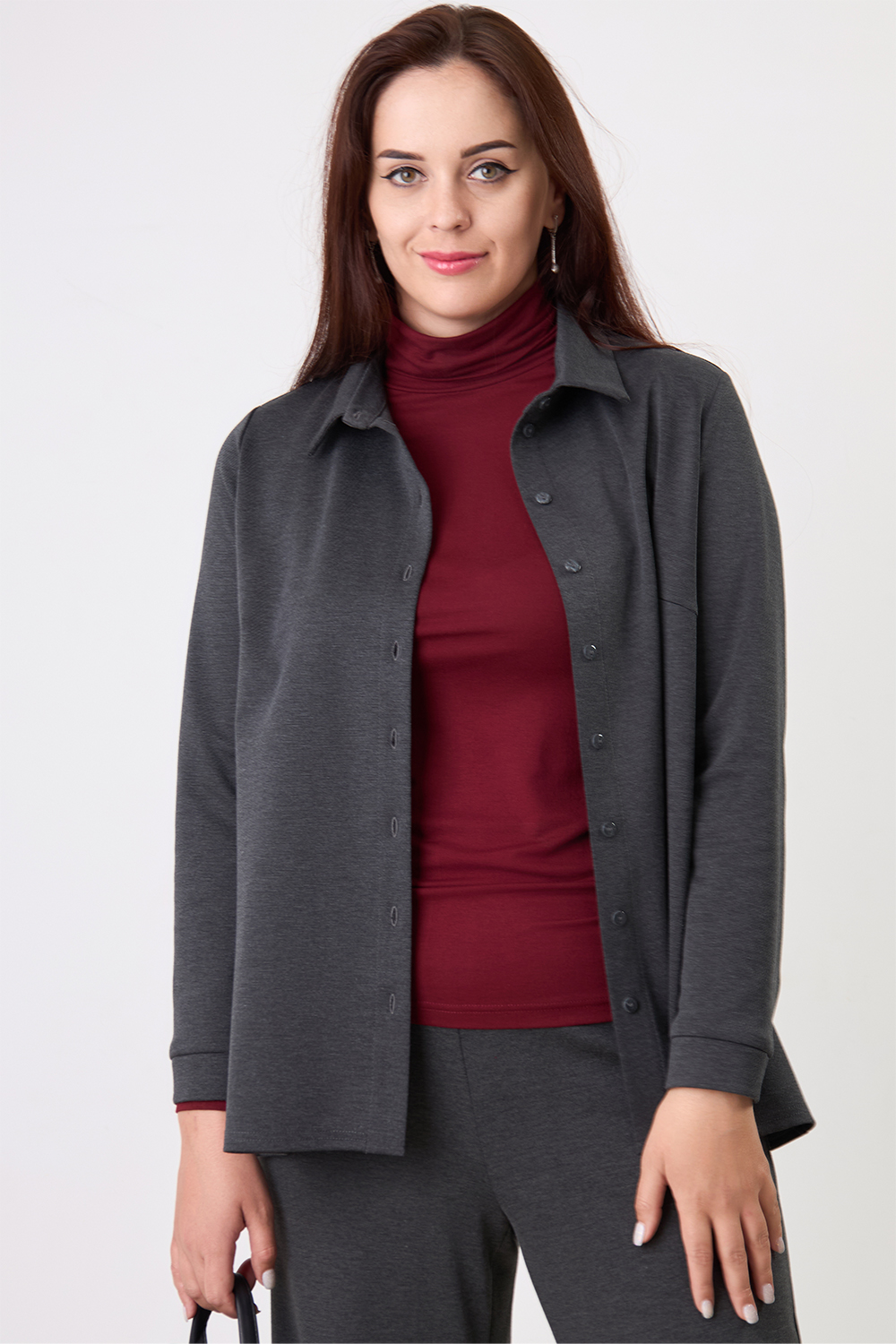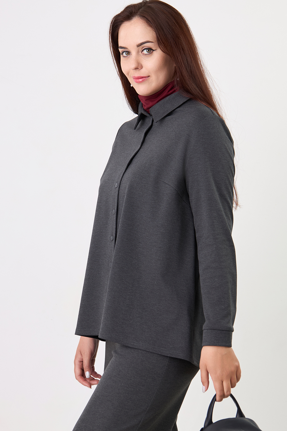 Описание: Блузка удлиненная из плотного трикотажа свободного кроя слегка расклешенная к низу со стояче-отложным воротником. На полочке две нагрудные выточки и центральная застежка на пуговицы. Рукава втачные длинные на манжетах.