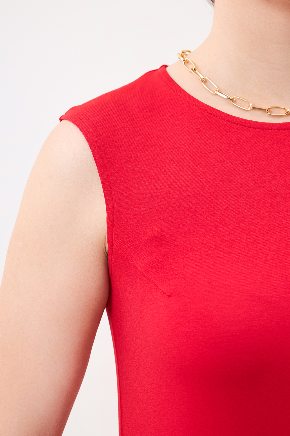 Описание: Топ прямого силуэта без рукавов со спущенной линией плеча, округлым вырезом горловины и небольшими разрезами по бокам внизу.