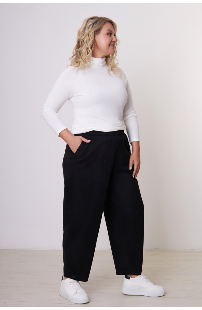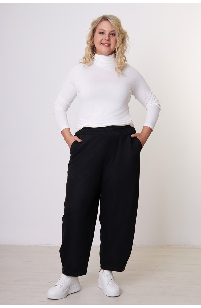Брюки не имеют застежку, талия фиксируется притачным поясом с эластичной резинкой.
