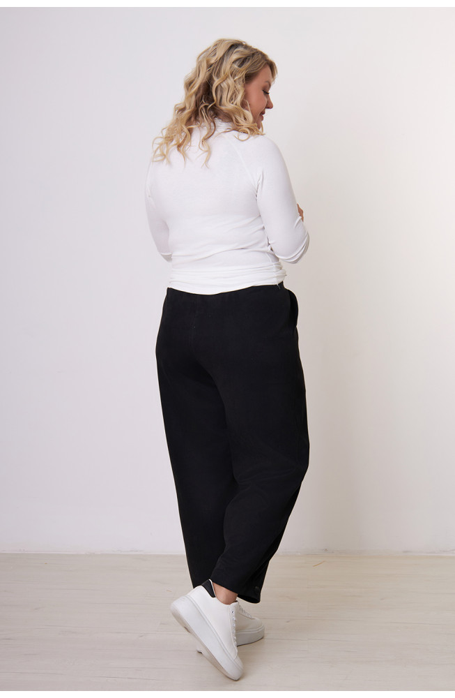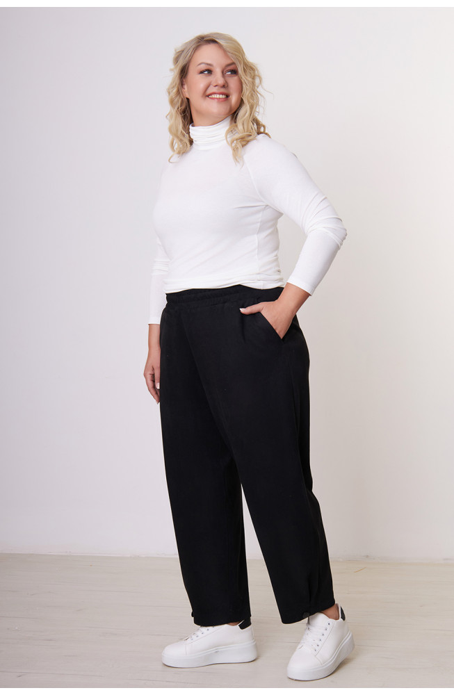 Описание: Брюки женские из замши имеют форму бананов, слегка зауженные к низу и свободные на бедрах, благодаря чему прекрасно содятся на широкие бедра и делают фигуру более стройнее.