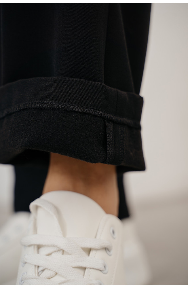 Описание: Брюки из костюмной ткани с начёсом по изнанке чуть зауженного к низу фасона на поясе с застежкой-молнией.