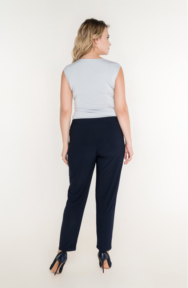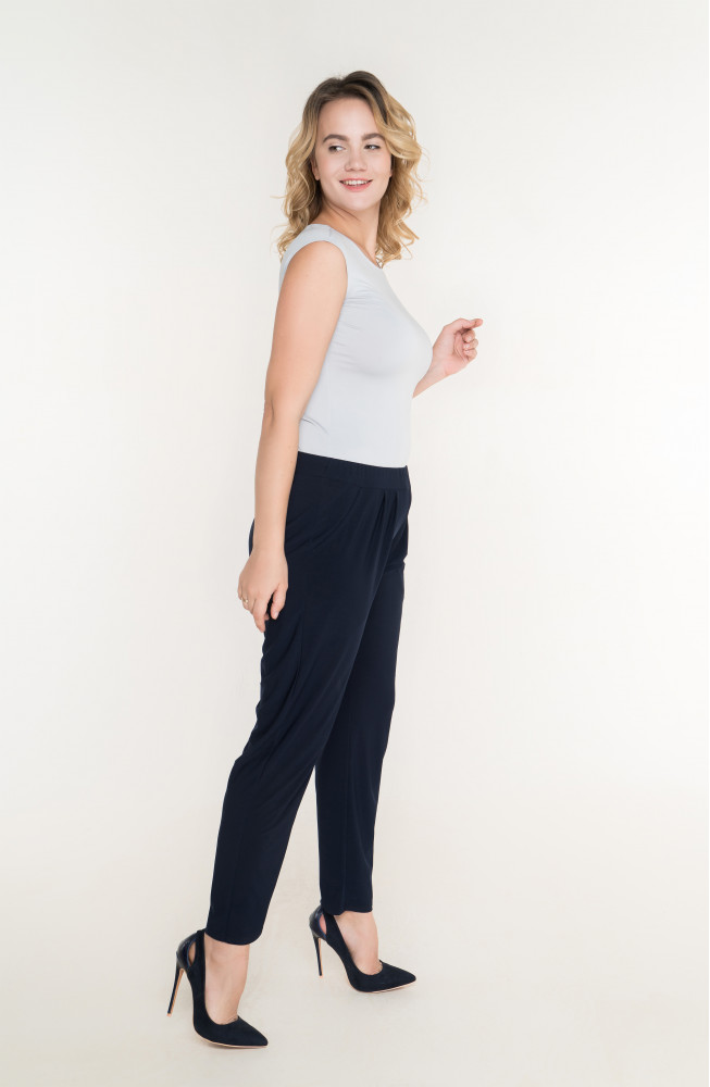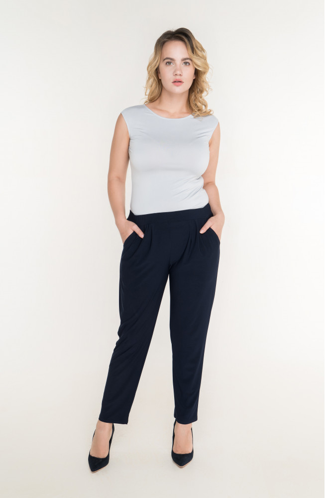 Описание: Брюки из тонкого трикотажа зауженные к низу с защипами от пояса, без застежки на резинке по талии с карманами по бокам.