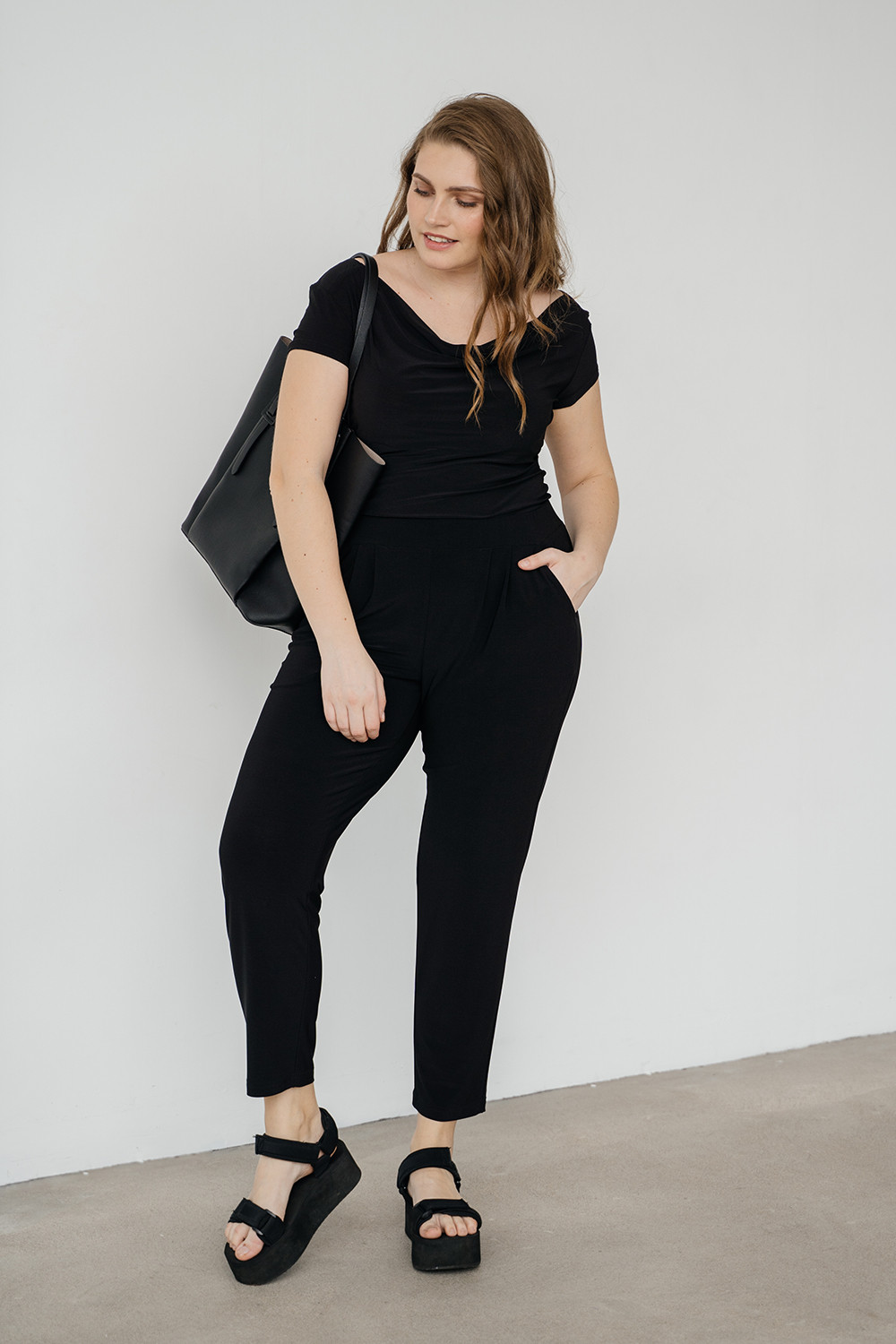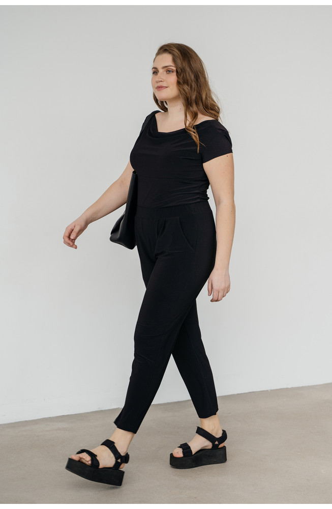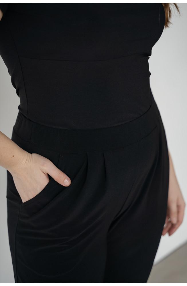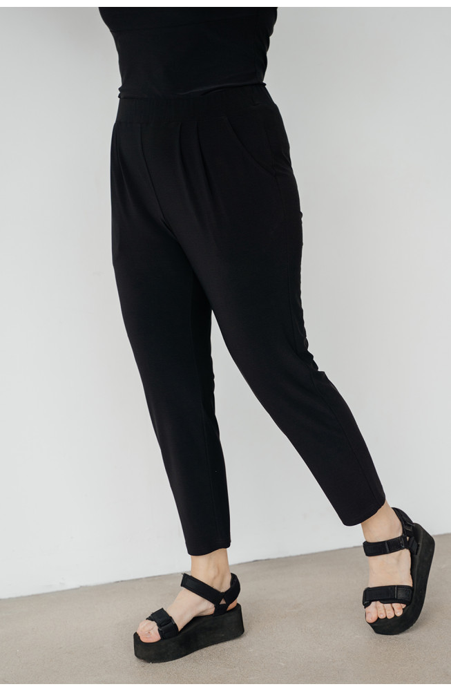 Описание: Брюки из тонкого трикотажа зауженные к низу с защипами от пояса, без застежки на резинке по талии с карманами по бокам.