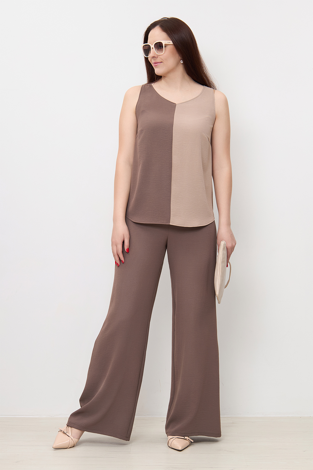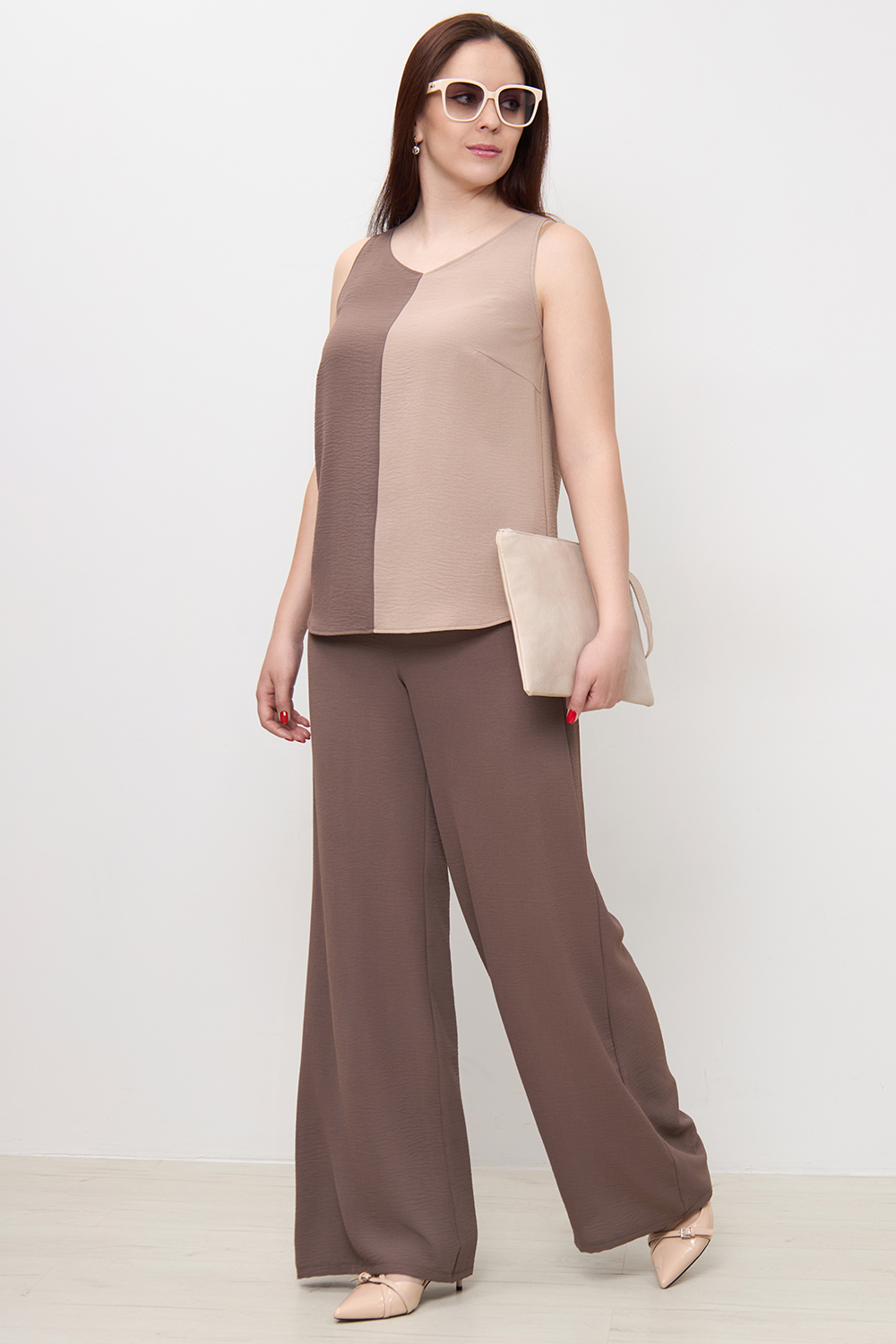 Брюки типа палаццо выглядят женственно и красиво драпируются. Высокая посадка надежно фиксирует изделие на талии. Скользящая, приятная к телу фактура полотна и широкий крой брюк обеспечивают хорошую вентиляцию при движении, и поэтому в жаркую погоду в брюках комфортно.