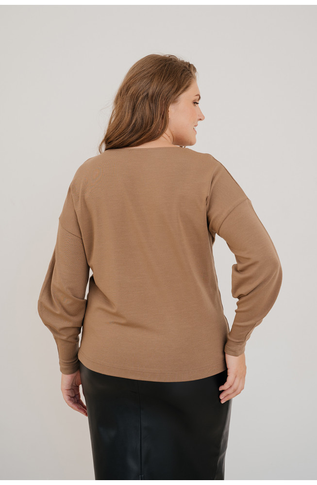 Описание: Джемпер из вязаного трикотажа прямого силуэта с рукавами расширенными сверху и зауженными по запястью. Вырез горловины "лодочка", линия плеча спущена.