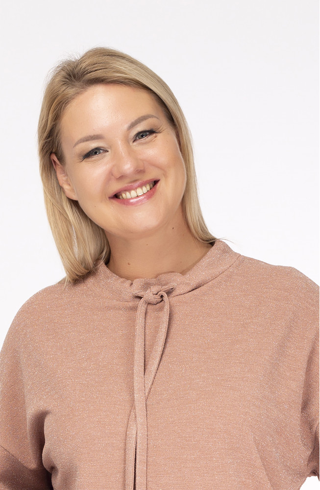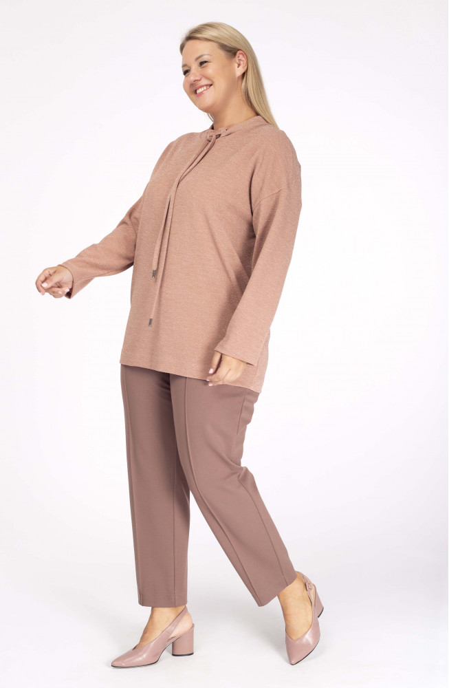Описание: Джемпер удлиненный из плотного трикотажа с люрексом силуэта oversize с воротником-стойкой с кулисой и шнурком и длинными рукавами на спущенной линии плеча.