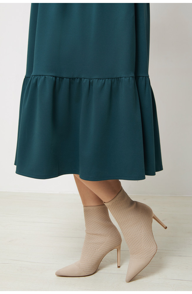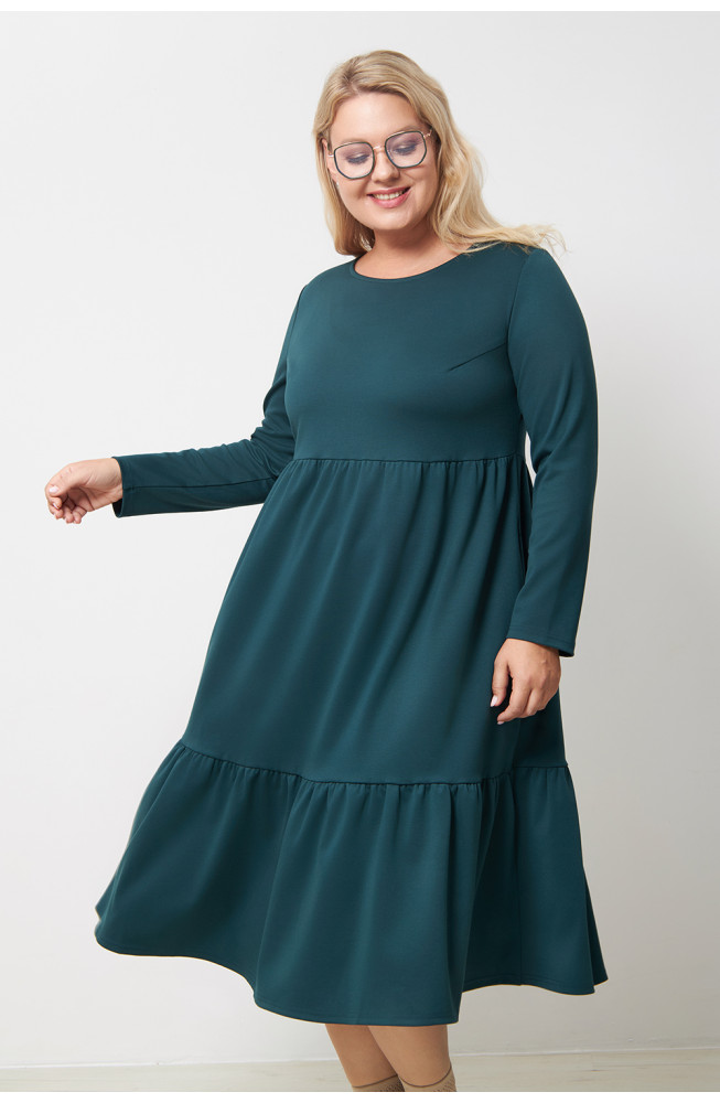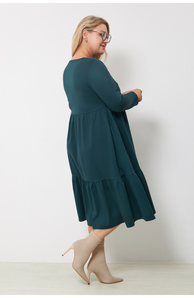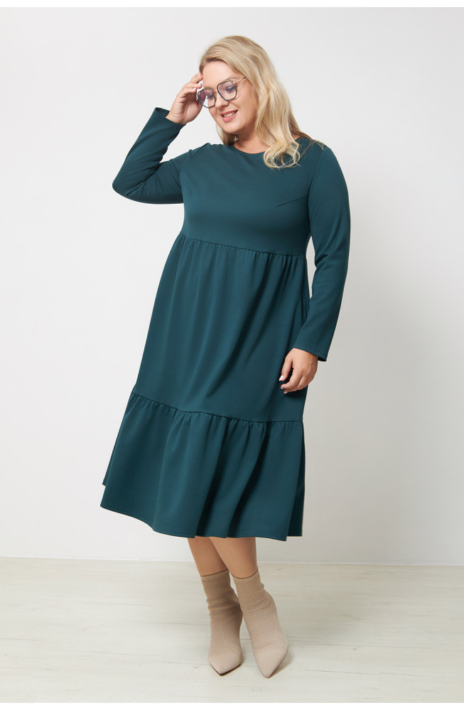 Описание: Платье из плотного трикотажа джерси трапецевидного силуэта с подрезом под грудью, длинными рукавами и нижней частью, состоящей из двух ярусов со сборками.