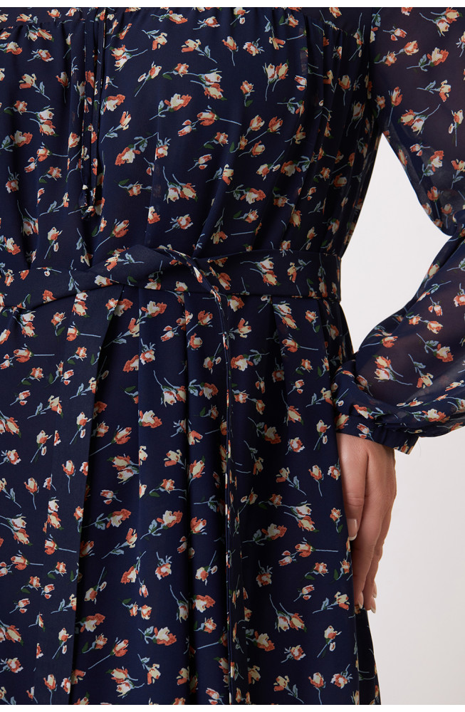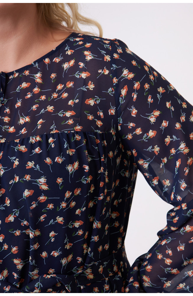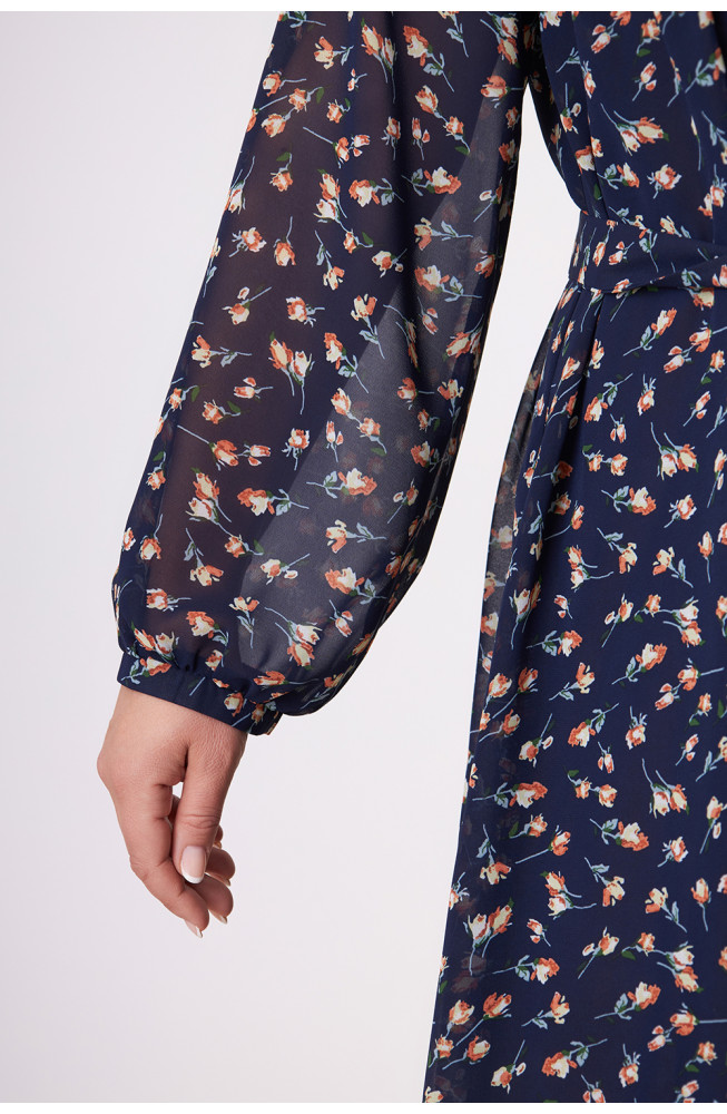 Модель А-силуэта с округлым вырезом горловины переходящим в форму капельки на завязках. Длинные рукава присборенные на окантовку по низу. Платье красиво выравнивает все контуры силуэта. Можно носить как с поясом, так и без него.