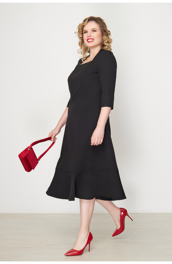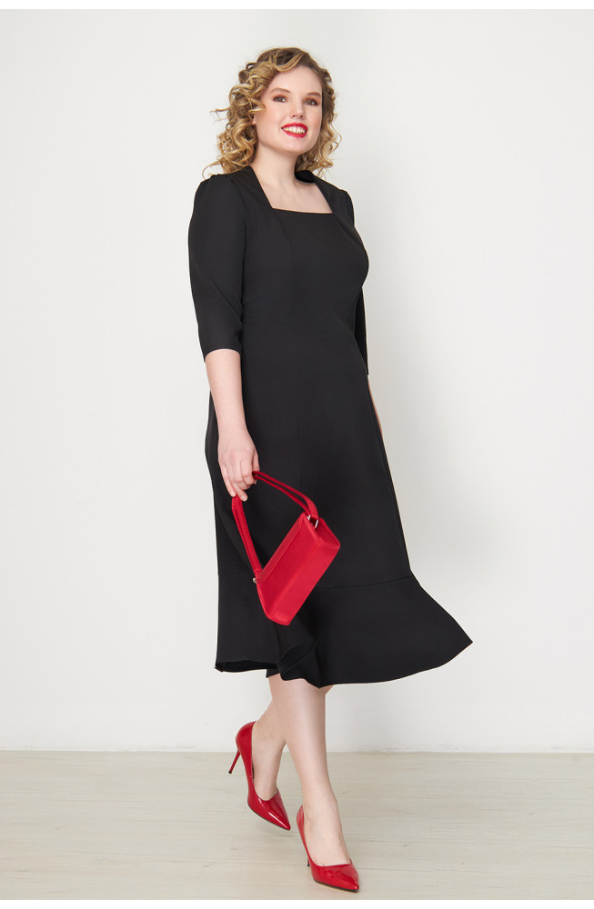 Описание: Платье из костюмной ткани-стрейч полуприлегающего силуэта с фигурным вырезом горловины и втачными рукавами 3/4 со сборками по окату. По низу изделия пришит широкий волан с разрезом по левой ноге.
