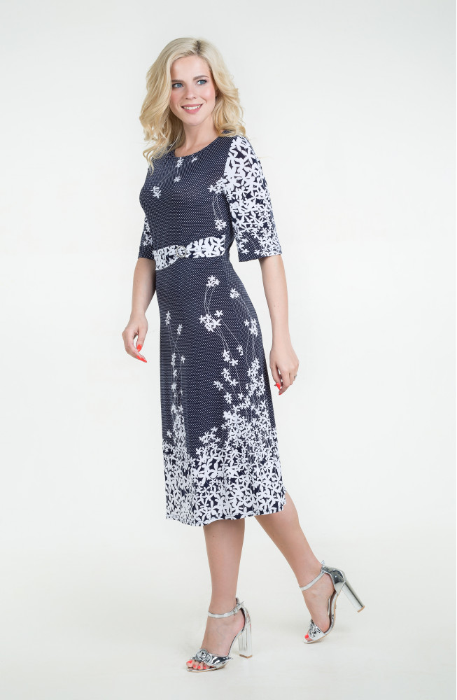 Описание: Платье из тонкого трикотажа "масло" приталенного силуэта расклешенное от бедра с расширенными рукавами до локтя и с поямом по талии с декоративной пряжкой.