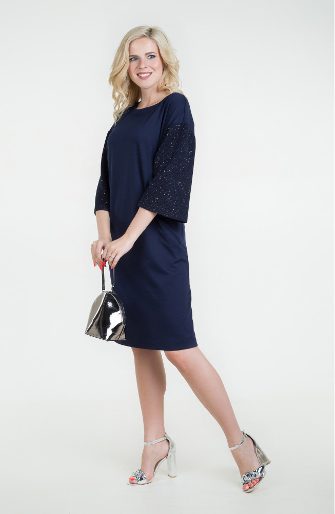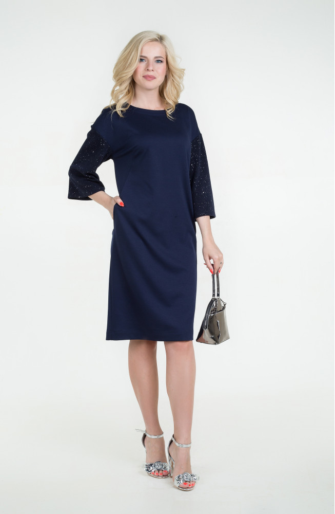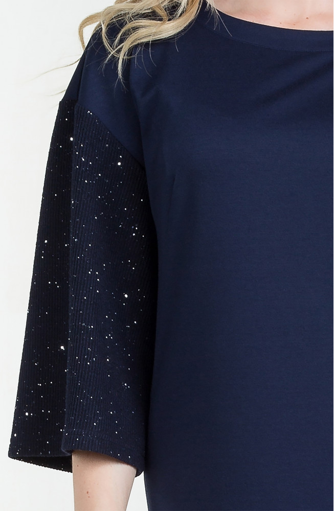 Описание: Платье из плотного трикотажа джерси прямого силуэта с расширенными рукавами на спущенном плече из вязаного трикотажа с блестками. По бокам платья располагаются подрезы-вытачки с карманами.