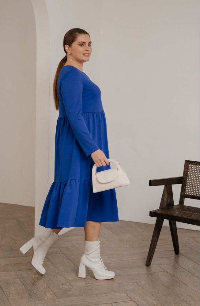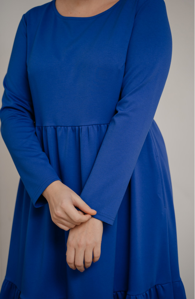 Описание: Трикотажное платье, из джерси, платье  А-силуэта, платье ярусное, с подрезом под грудью, и нижней частью, состоящей из двух ярусов со сборками, платье с длинными рукавами, платье миди, платье  васильковое.