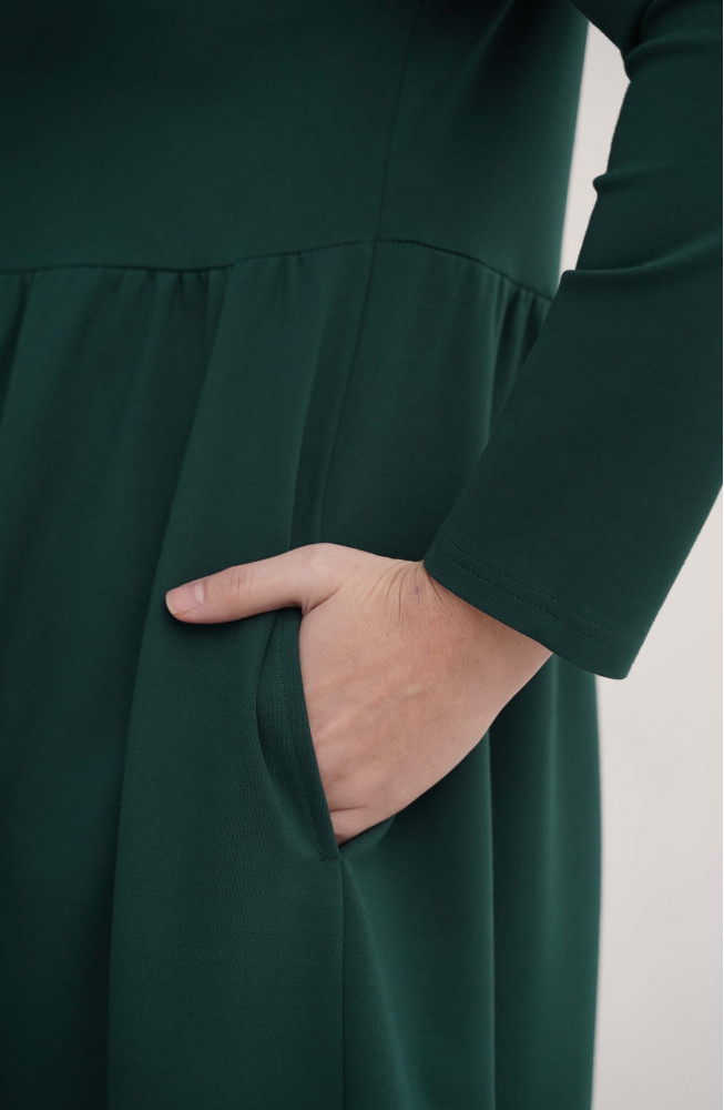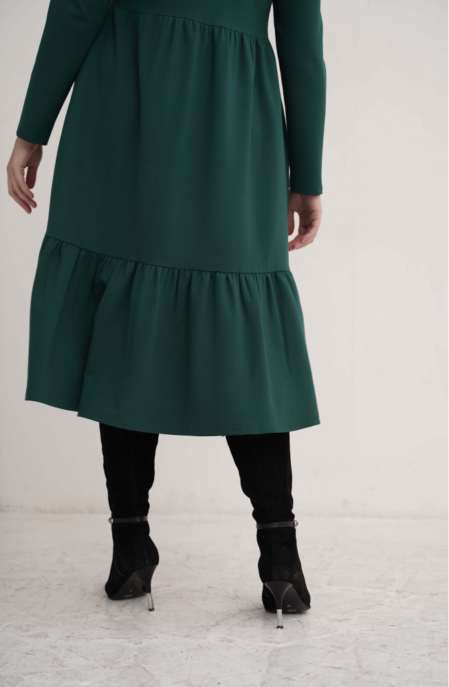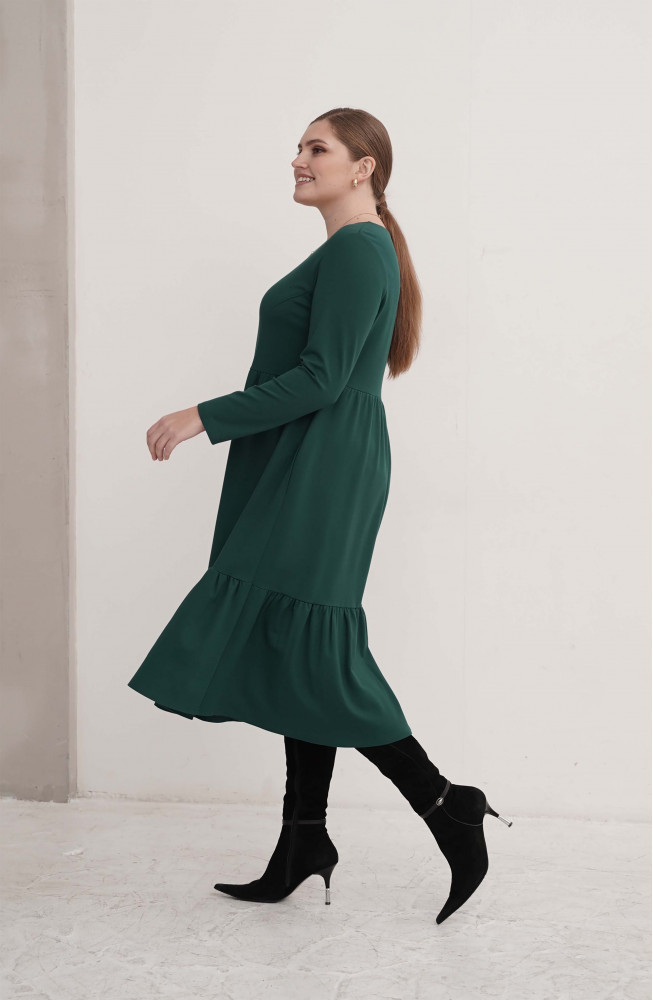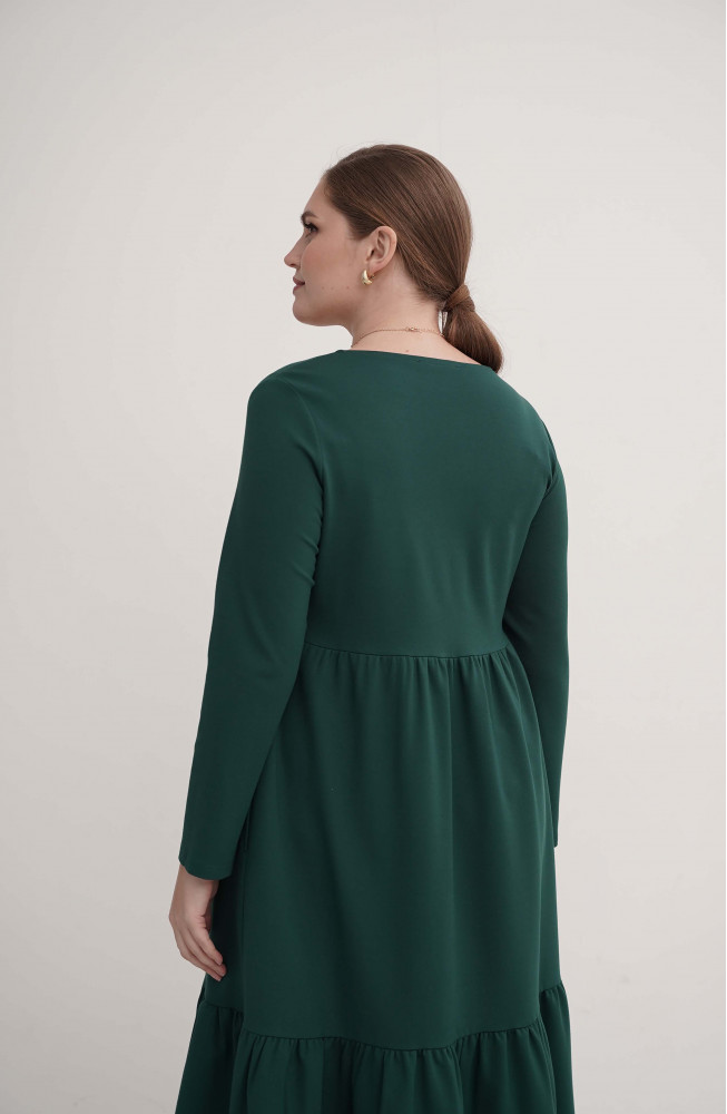 Описание: Платье из плотного трикотажа трапецевидного силуэта с подрезом под грудью, длинными рукавами и нижней частью, состоящей из двух ярусов со сборками.