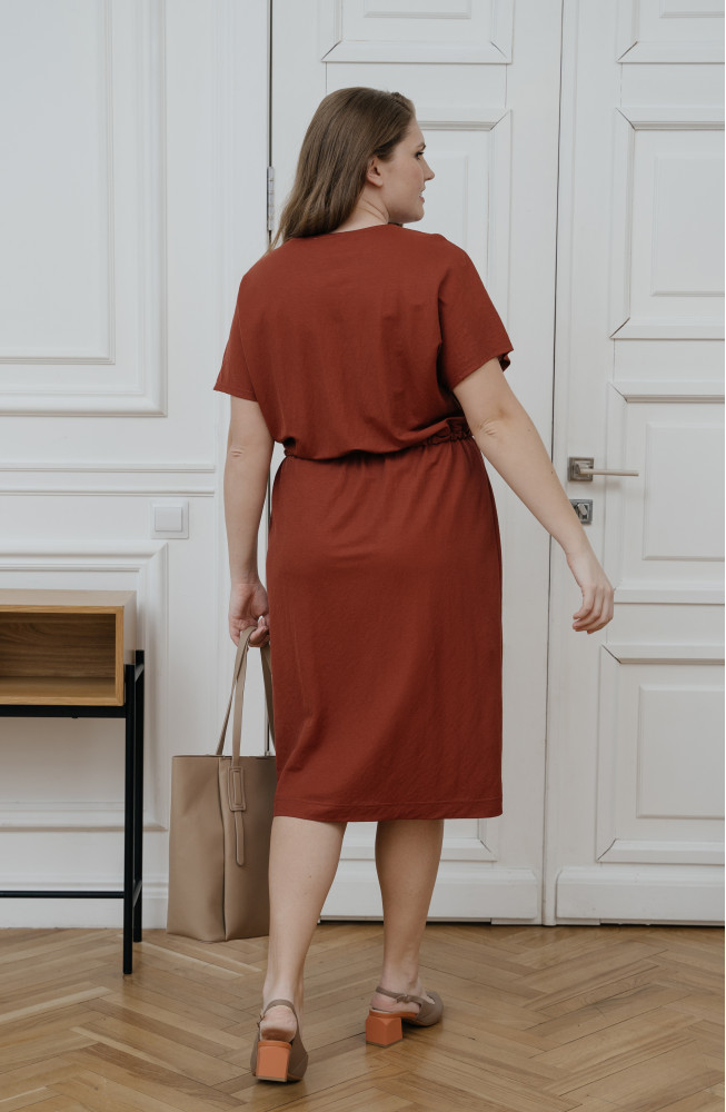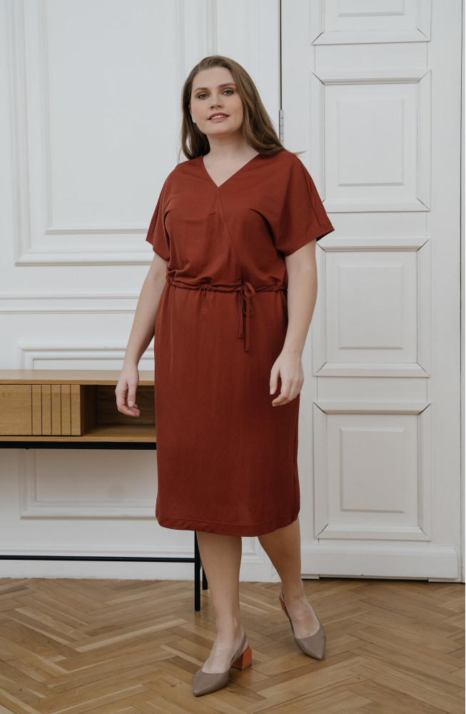 Описание: Платье из тонкого трикотажа свободного силуэта в верхней части и прямое в нижней части, с V-образным вырезом горловины с имитацией запаха, со спущенным плечом без рукавов и на кулиске с завзкой по талии.