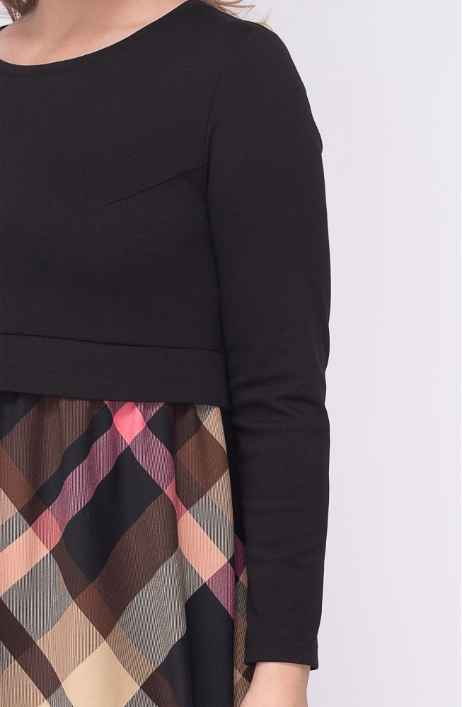 Описание: Платье из плотного трикотажа джерси полуприлегающего силуэта с подрезом по талии с втачным поясом-планкой. Нижняя часть платья со сборкой по талии из принтованного трикотажа, верхняя часть платья однотонная.