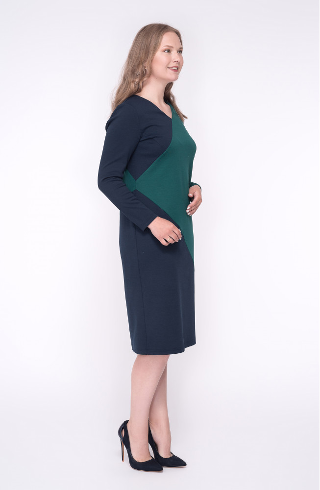 Описание: Платье из плотного трикотажа джерси в сочетании двух цветов с имитацией запаха, прямого силуэта с V-образным вырезом горловины и длинными рукавами.