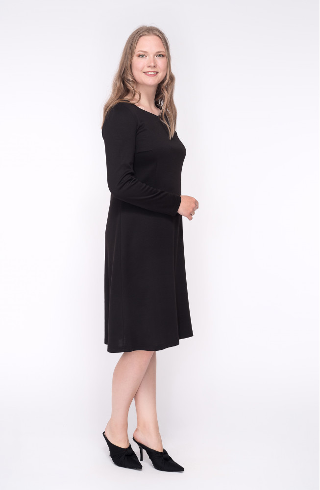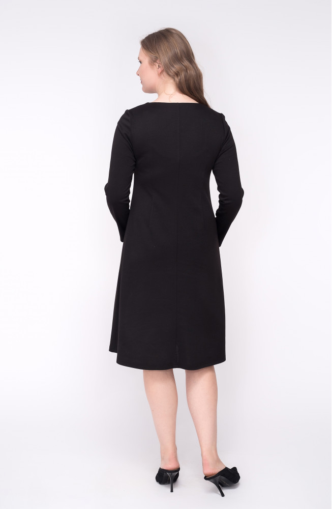 Описание: Платье из плотного трикотажа полуприлегающего силуэта расклешеное к низу с фигурным вырезом горловины и длинными рукавами.