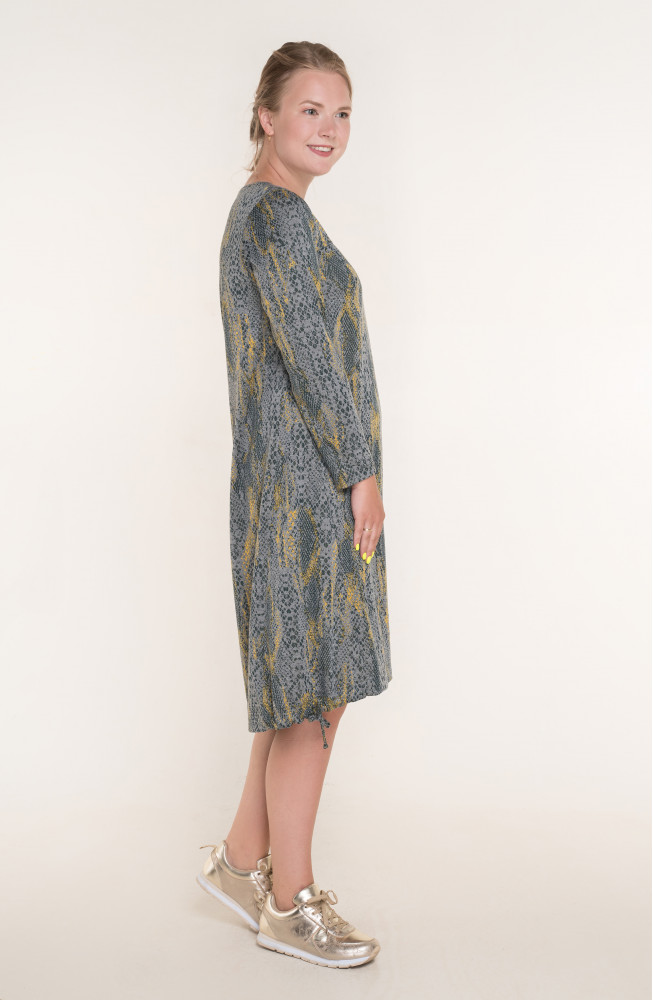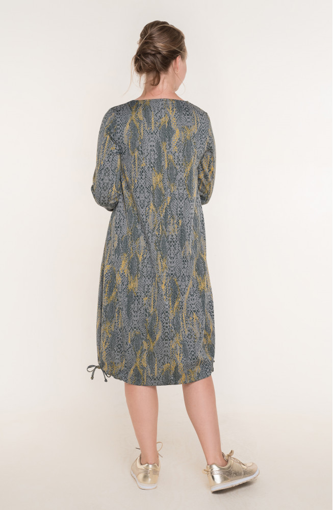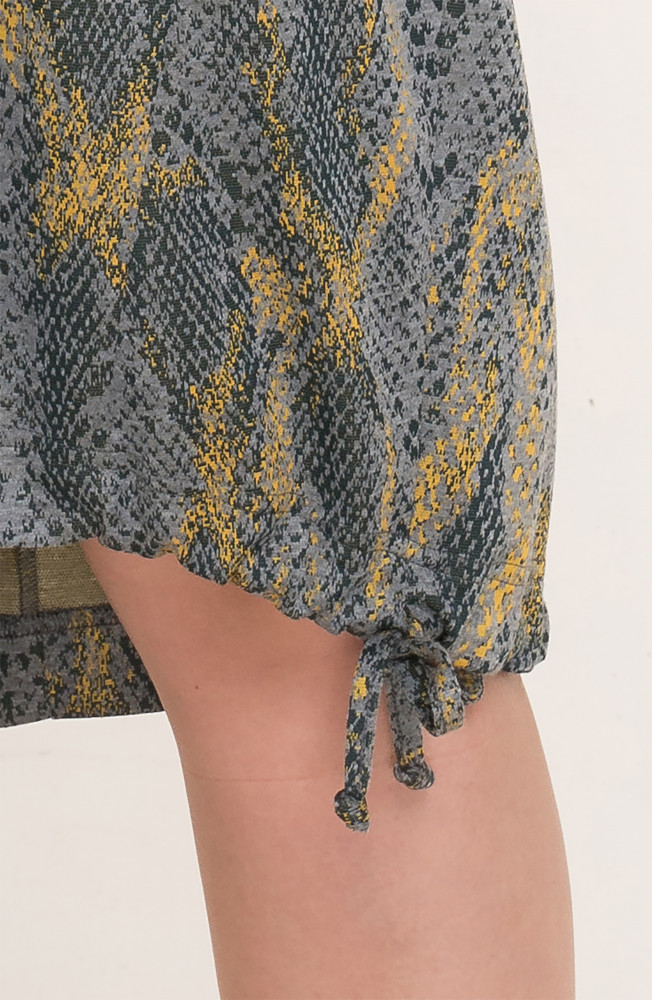 Описание: Платье из плотного трикотажа силуэта "баллон" с округлым вырезом горловины, кокеткой над линией груди, с длинными рукавами, диагональными швами от бедра до низа с кулисками по низу.