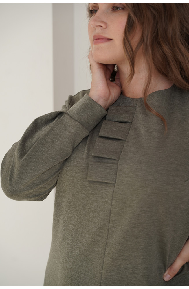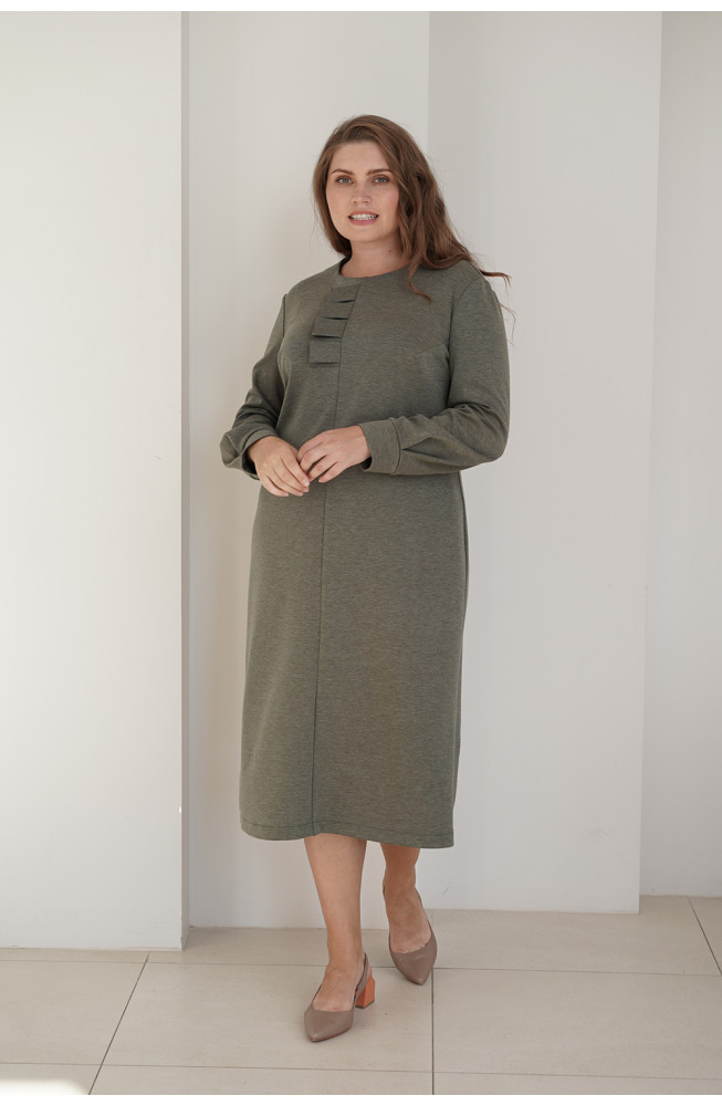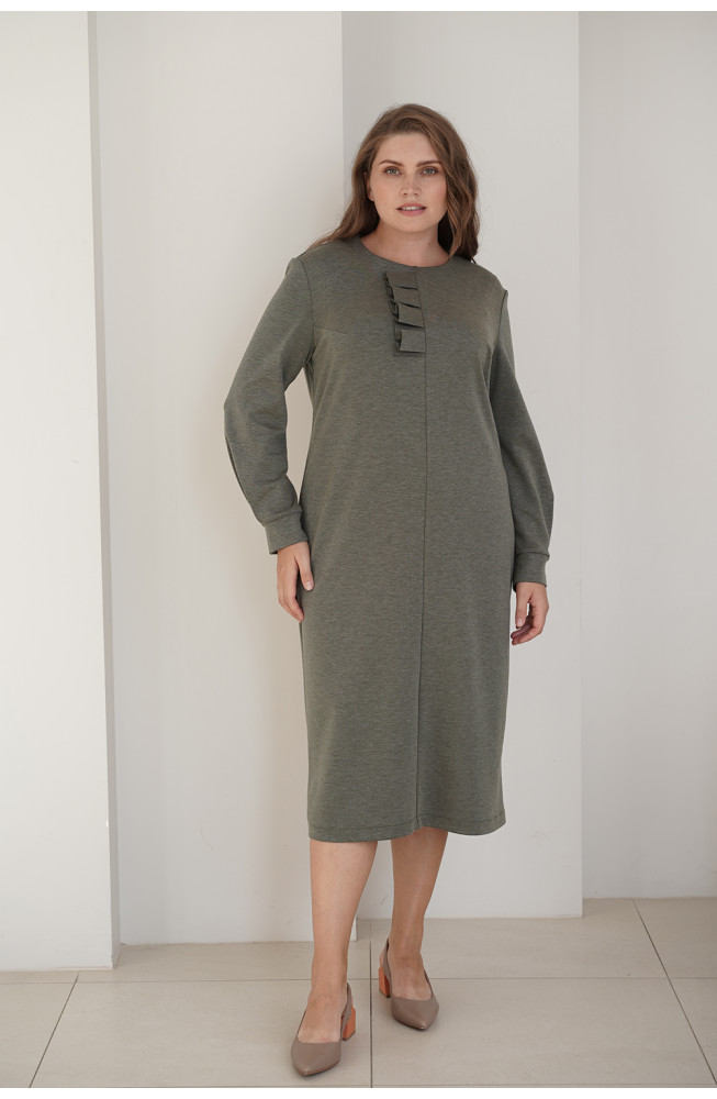 Описание: Платье из плотного трикотажа джерси полуприлегающего силуэта с декоративной рюшей со складками по груди, с длинными рукавами на манжетах и с округлым вырезом горловины. Платье длиной до середины голени.
