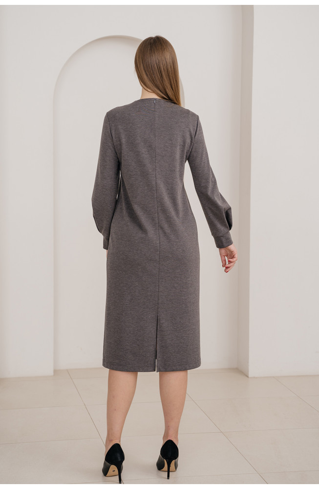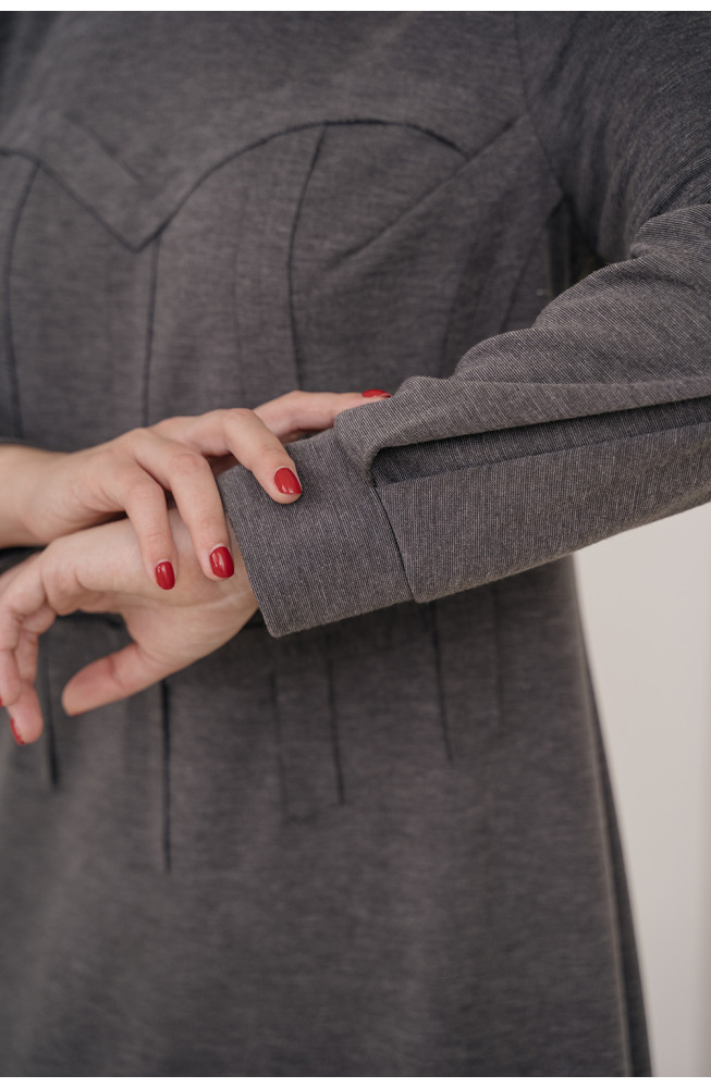 Описание: Платье из плотного трикотажа джерси полуприлегающего силуэта с длинными рукавами на манжетах, с округлым вырезом горловины и с декоративной имитацией корсета спереди в виде пришитых лент из трикотажа. Платье длиной до середины голени.