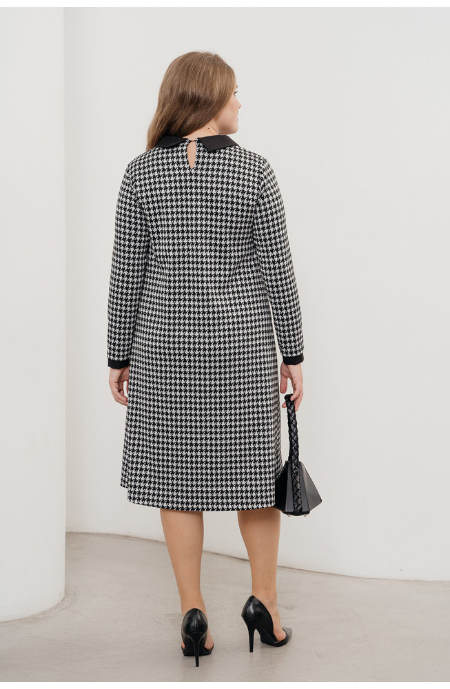 Описание: Платье из плотного трикотажа с принтом "гусиная лапка" полуприлегающего силуэта с небольшим клешением от бедра, с длинными рукавами с манжетами из отделочного полотна и со стояче-отложным воротником по горловине также из отделки. По горловине сзади имеется застежка на пуговицу.