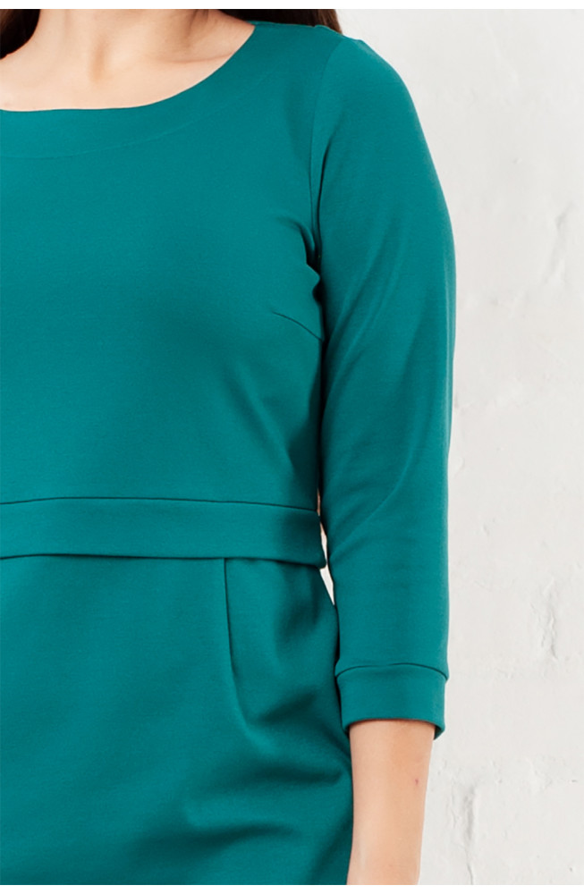 Описание: Платье приталенного силуэта из плотного трикотажа джерси с округлым вырезом горловины с отделочной планкой, талия также подчеркнута поясом-планкой из отделки, рукава 3/4.