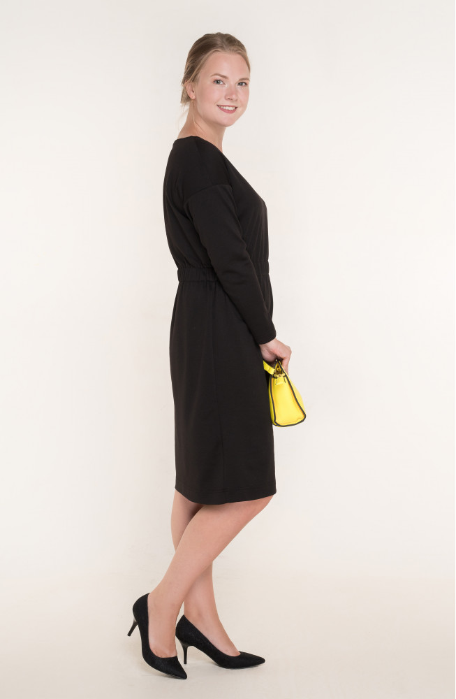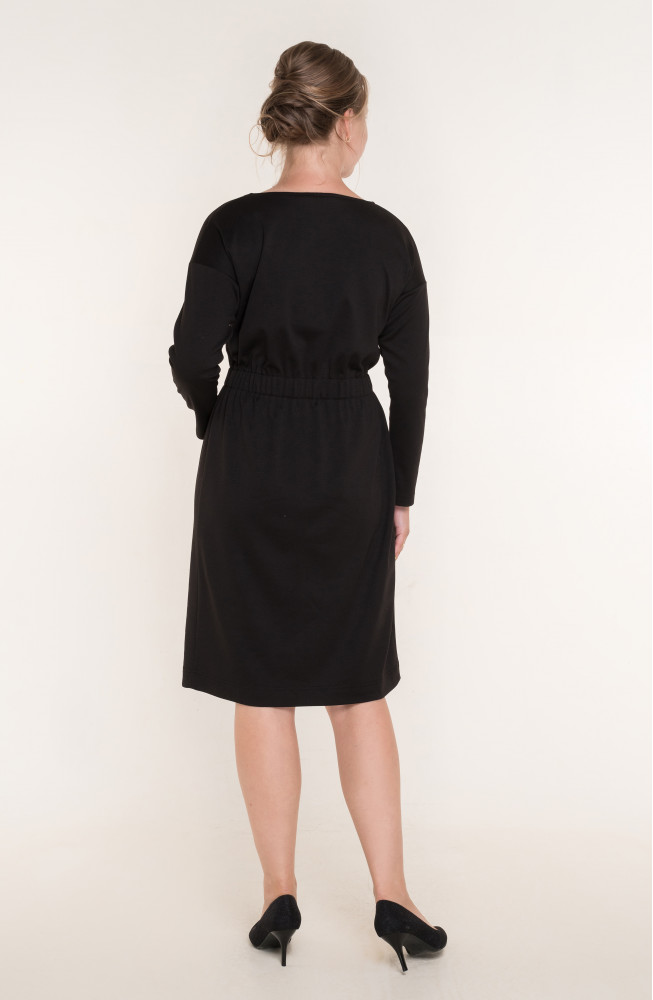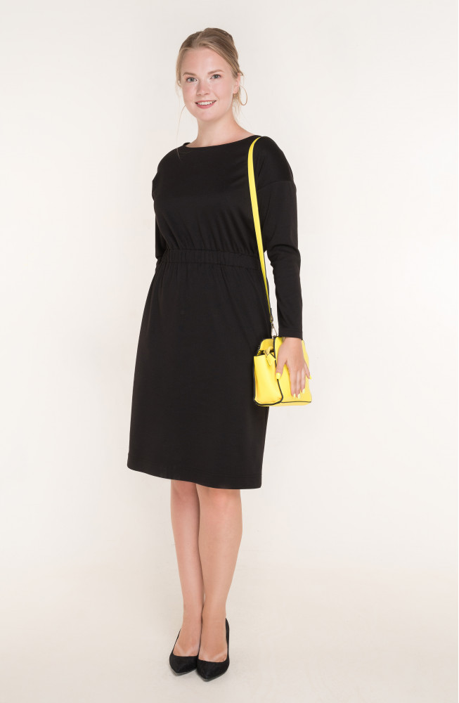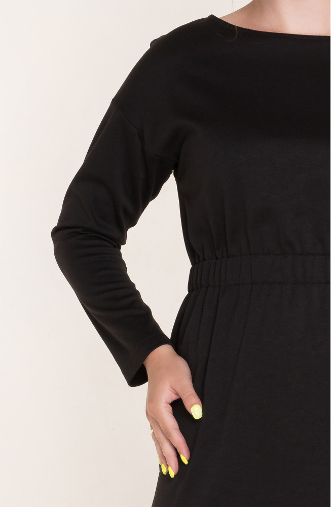 Описание: Платье из плотного трикотажа джерси прямого силуэта на резинке по талии с длинными рукавами на спущенном плече и округлым вырезом горловины.
