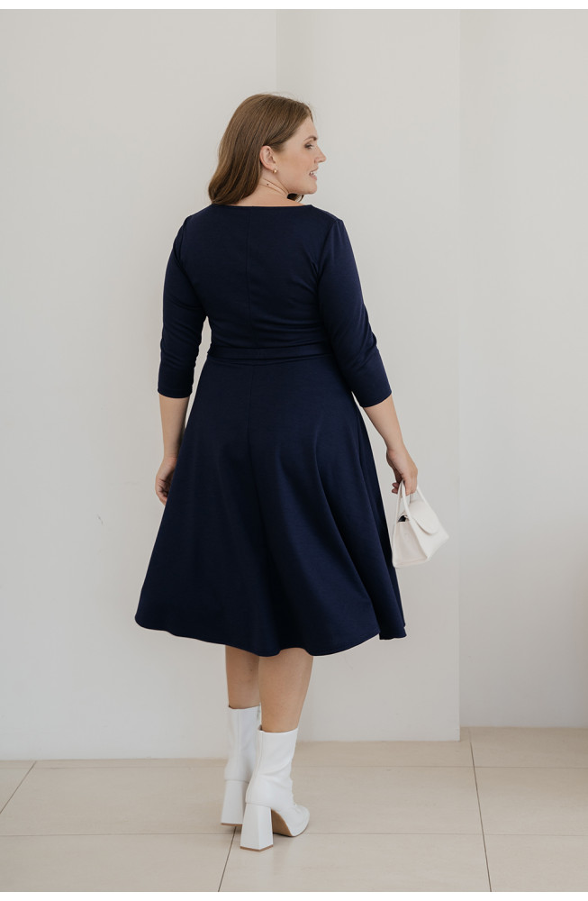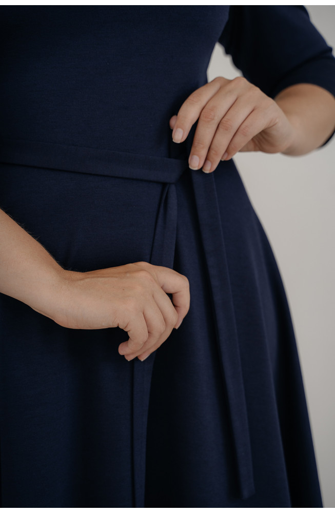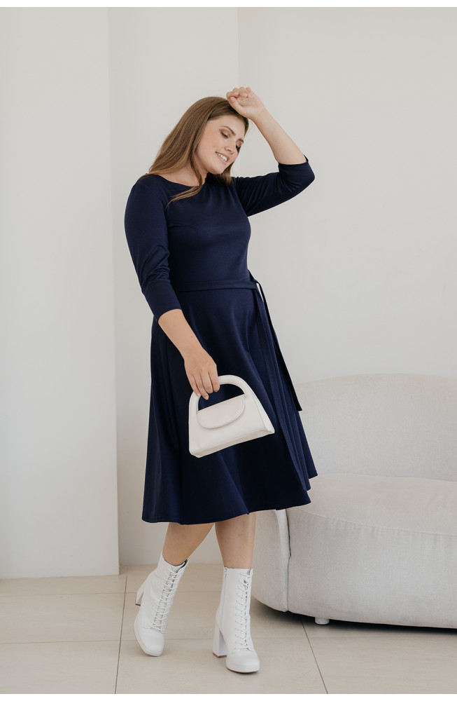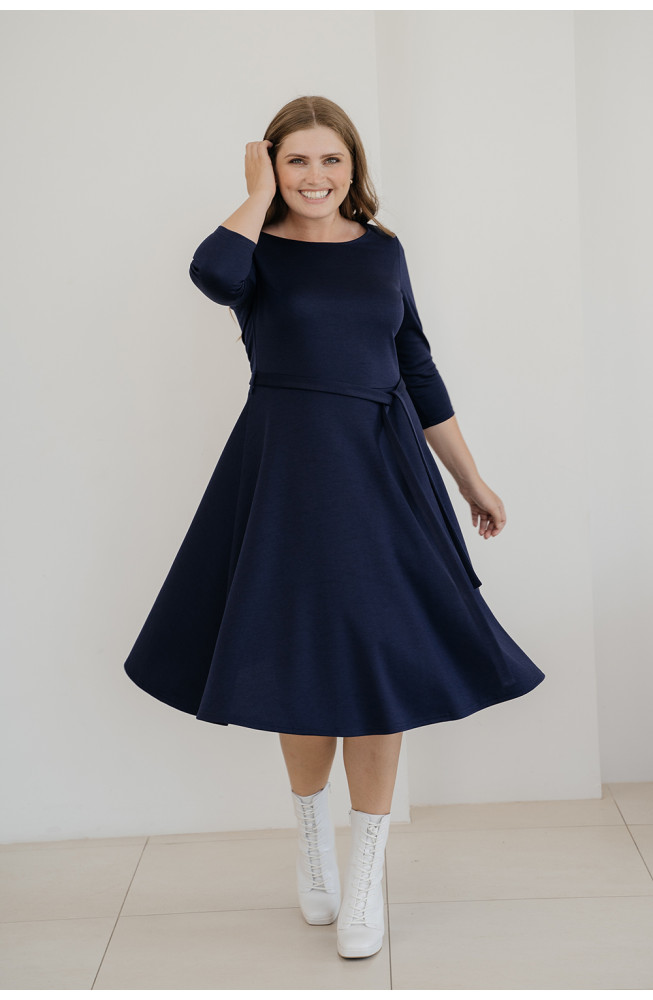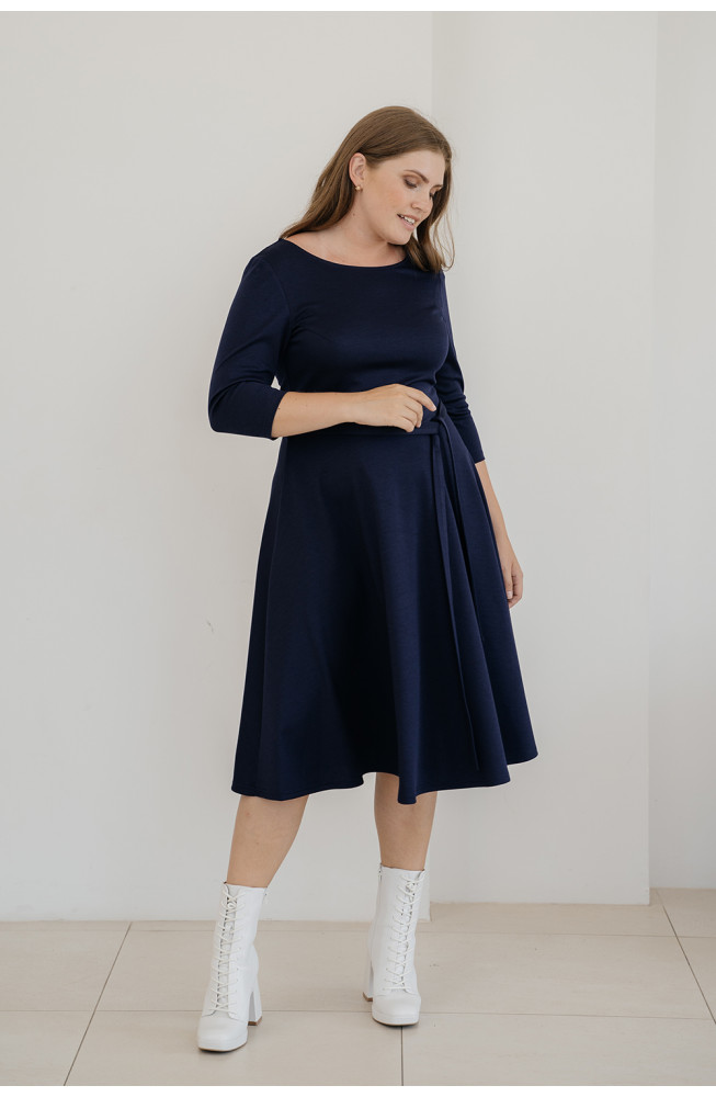 Описание: трикотажное платье, из джерси, отрезное по талии, с расклешеной юбкой, приталенного силуэта, платье с вырезом лодочка и рукавами 3/4, с поясом на талии.