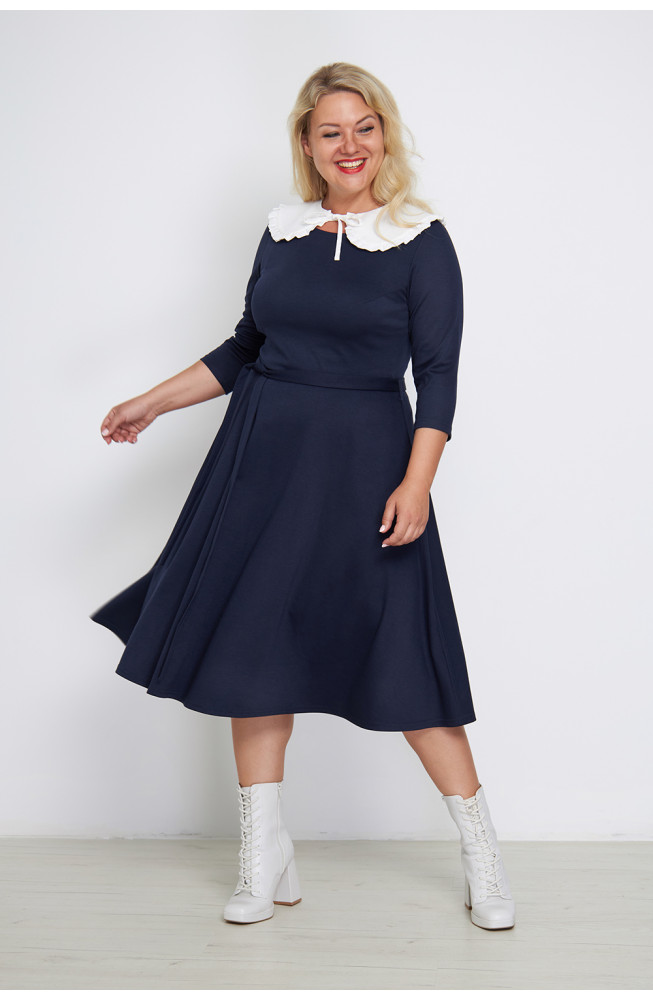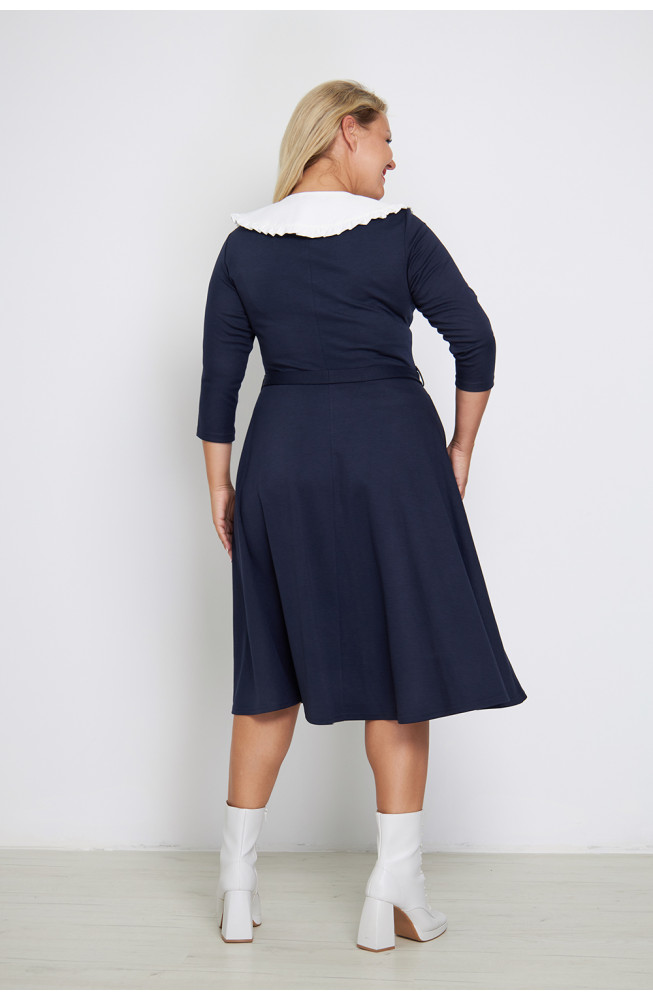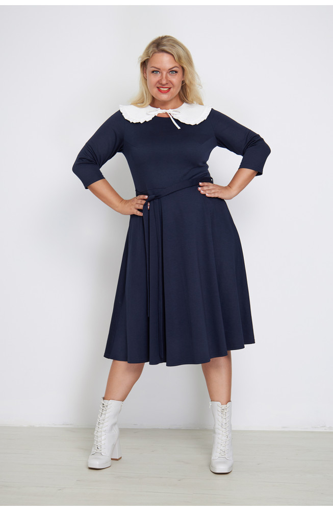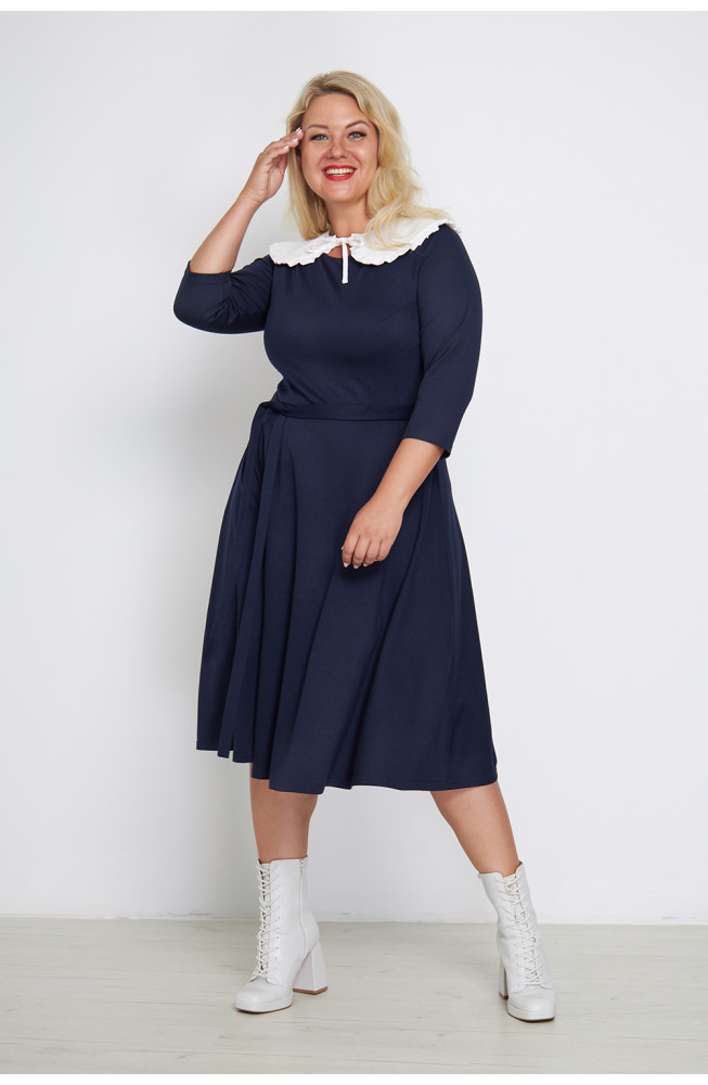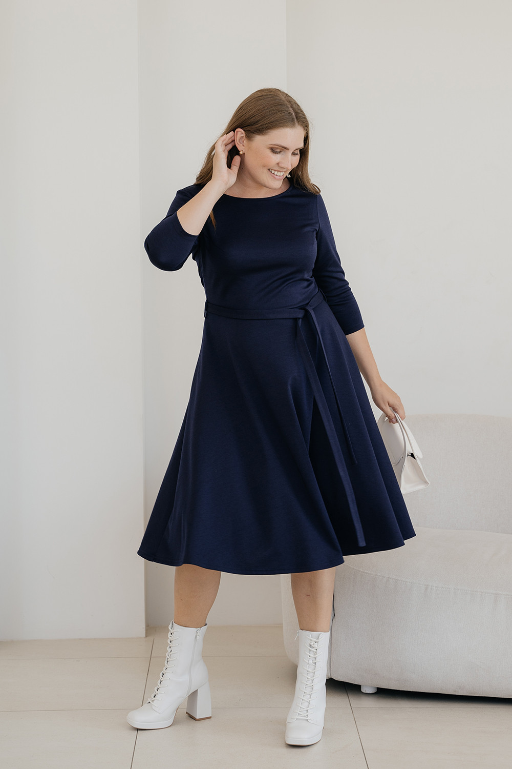 Описание: трикотажное платье, из джерси, отрезное по талии, с расклешеной юбкой, приталенного силуэта, платье с вырезом лодочка и рукавами 3/4, с поясом на талии.