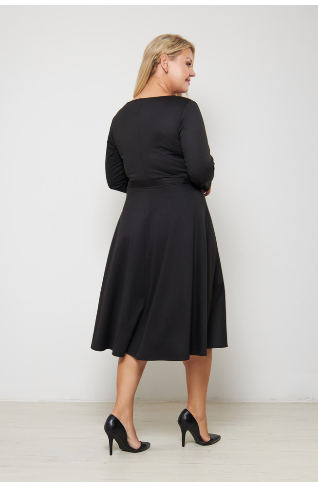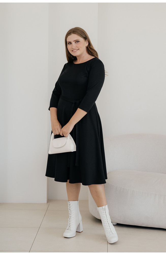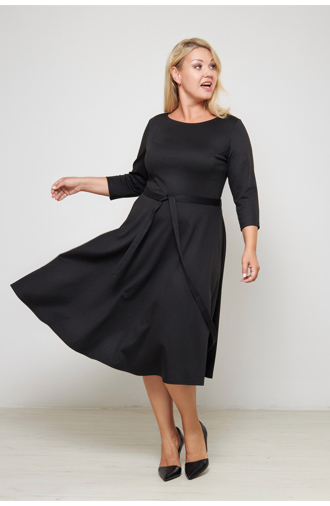Описание: трикотажное платье,  из джерси, отрезное по талии,  с расклешеной юбкой, приталенного силуэта, платье с вырезом лодочка и  рукавами 3/4, с поясом на талии.