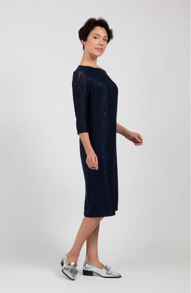 Описание: Платье из гипюра на подкладке полуприлегающего силуэта с округлым вырезом горловины и рукавами 3/4. Длина - ниже колена