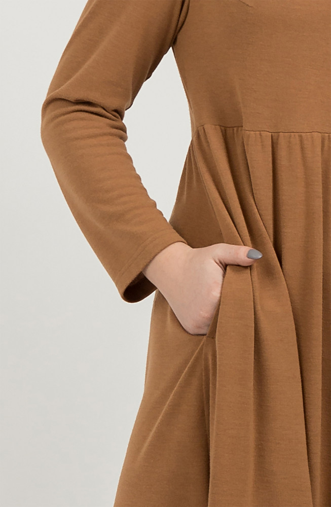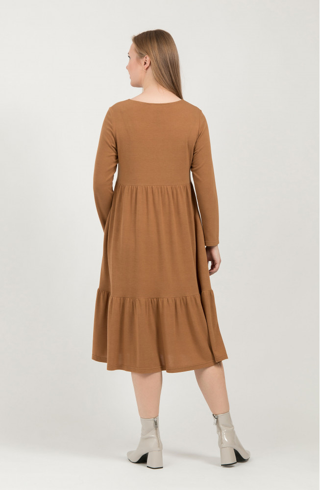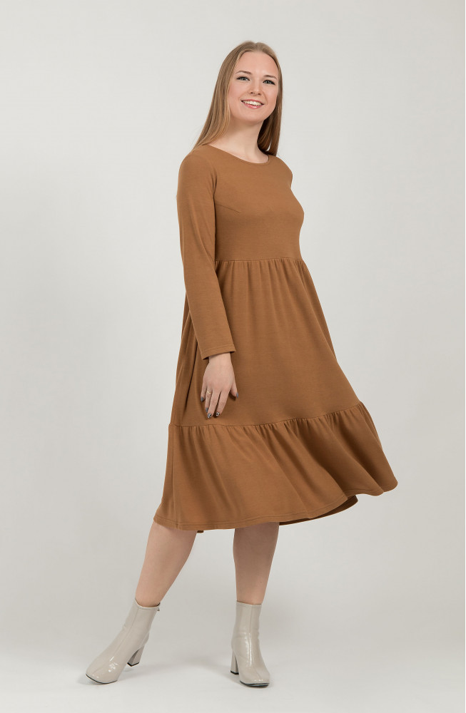 Описание: Платье из вязаного трикотажа трапецевидного силуэта с подрезом под грудью, длинными рукавами и нижней частью состоящей из двух ярусов со сборками.