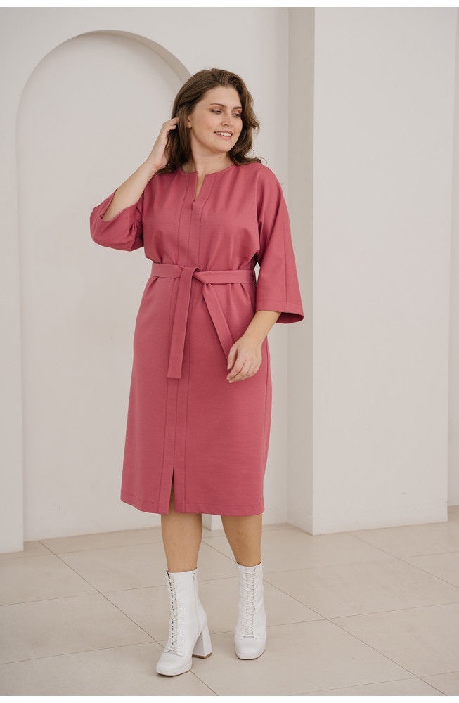 Описание: Платье из плотного трикотажа джерси полуприлегающего силуэта с широкими цельнокроенными рукавами длиной 3/4, с округлым вырезом горловины с разрезом, с разрезом по низу спереди и с вертикальными планками по центру переда. Талию подчеркивает пояс-кушак, платье длиной до середины голени.