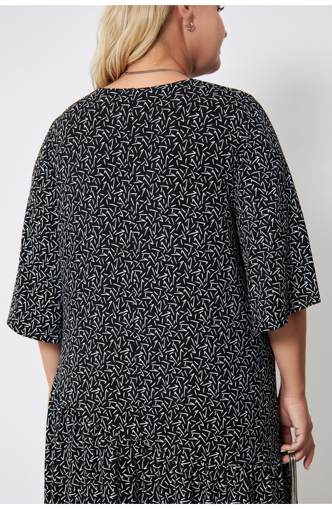Описание: Платье из  тонкого вискозного трикотажного полотна с абстрактным принтом, прямого силуэта с ассиметричным подрезом от линии бедер, V- образным вырезом, втачным, расширенным к низу рукавом.