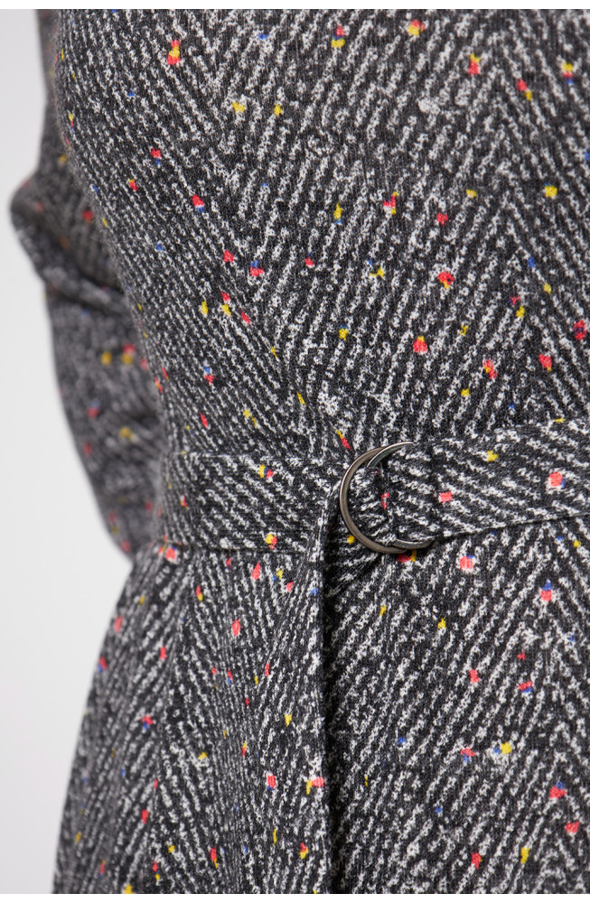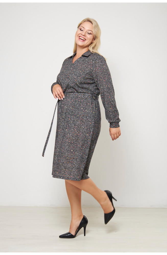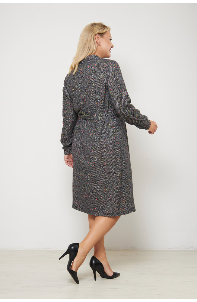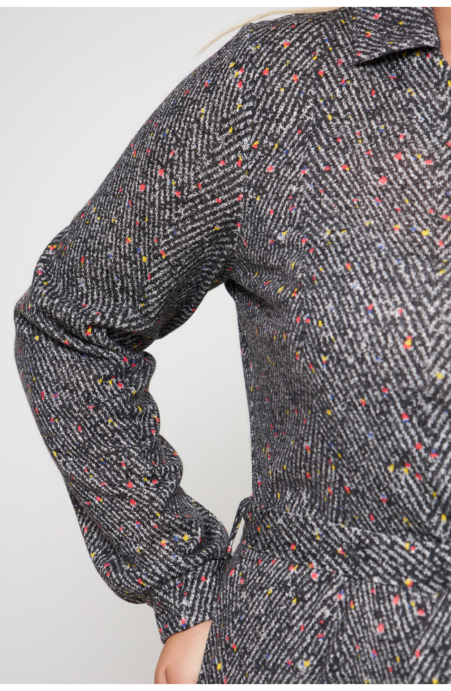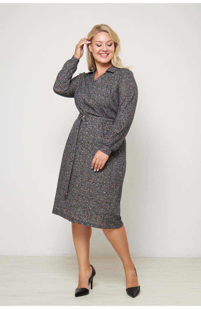 Описание: Платье из из мягкого трикотажа "ангора" с принтом "крапинка" полуприлегающего силуэта на регулируемом поясе с полукольцами, с V-образным вырезом головины с воротником и длинными рукавами на манжетах.
