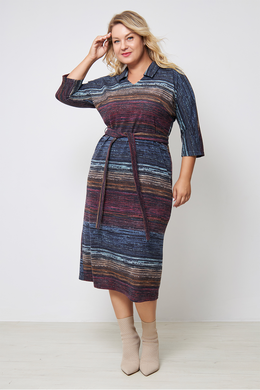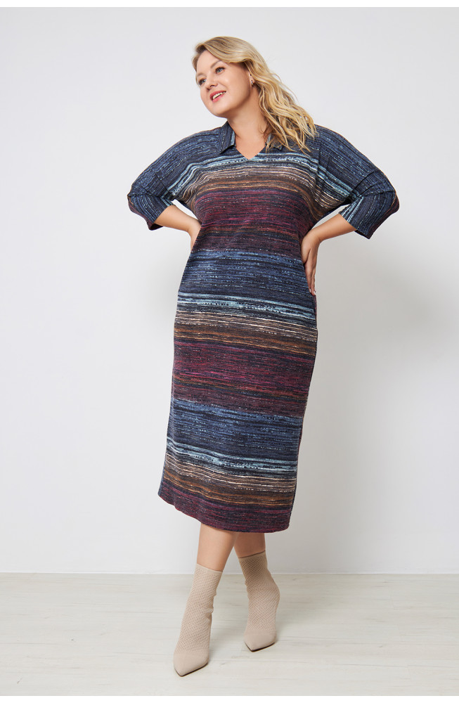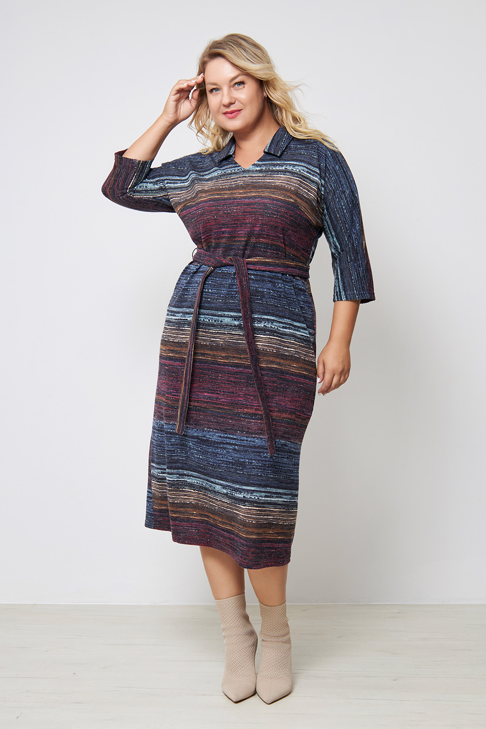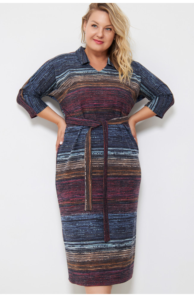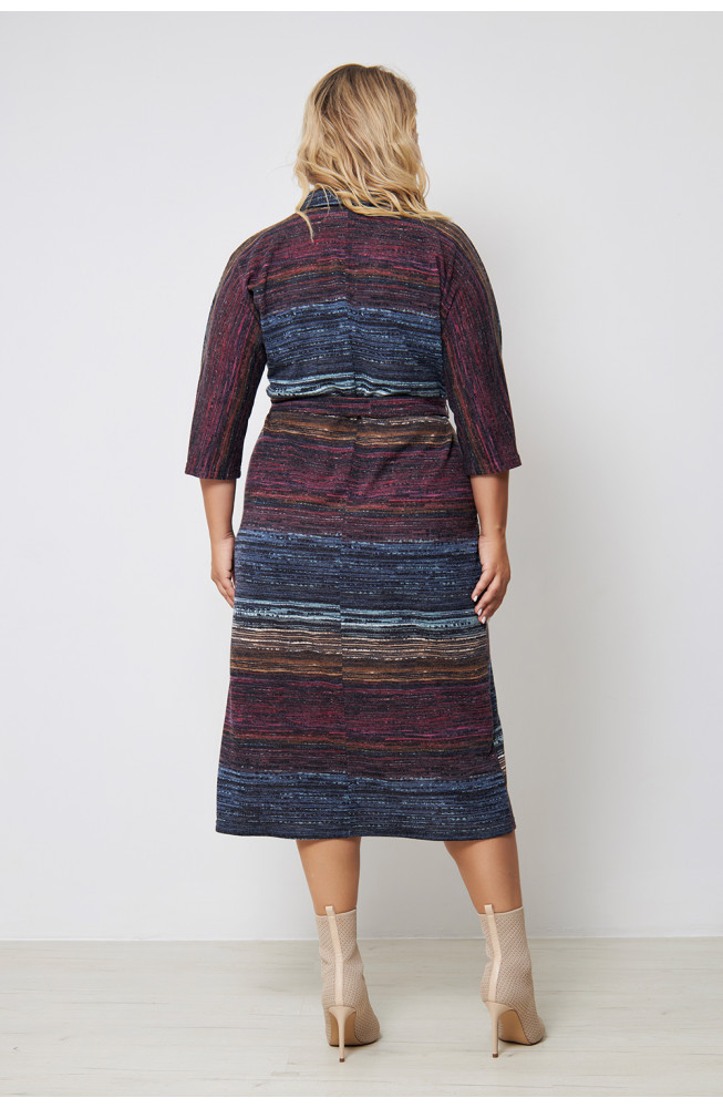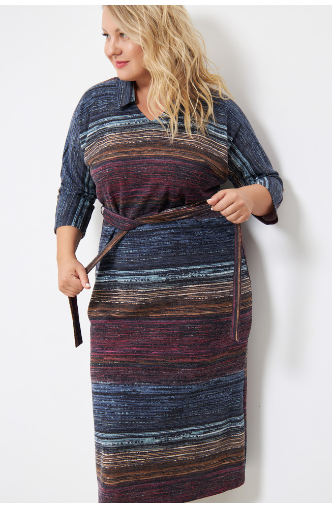 Описание: Платье из плотного трикотажа-ангора "полоска" , полуприлегающего силуэта с V-образным вырезом горловины и цельнокроенными рукавами 3/4. Талию подчеркивает ремешок из основной ткани.
