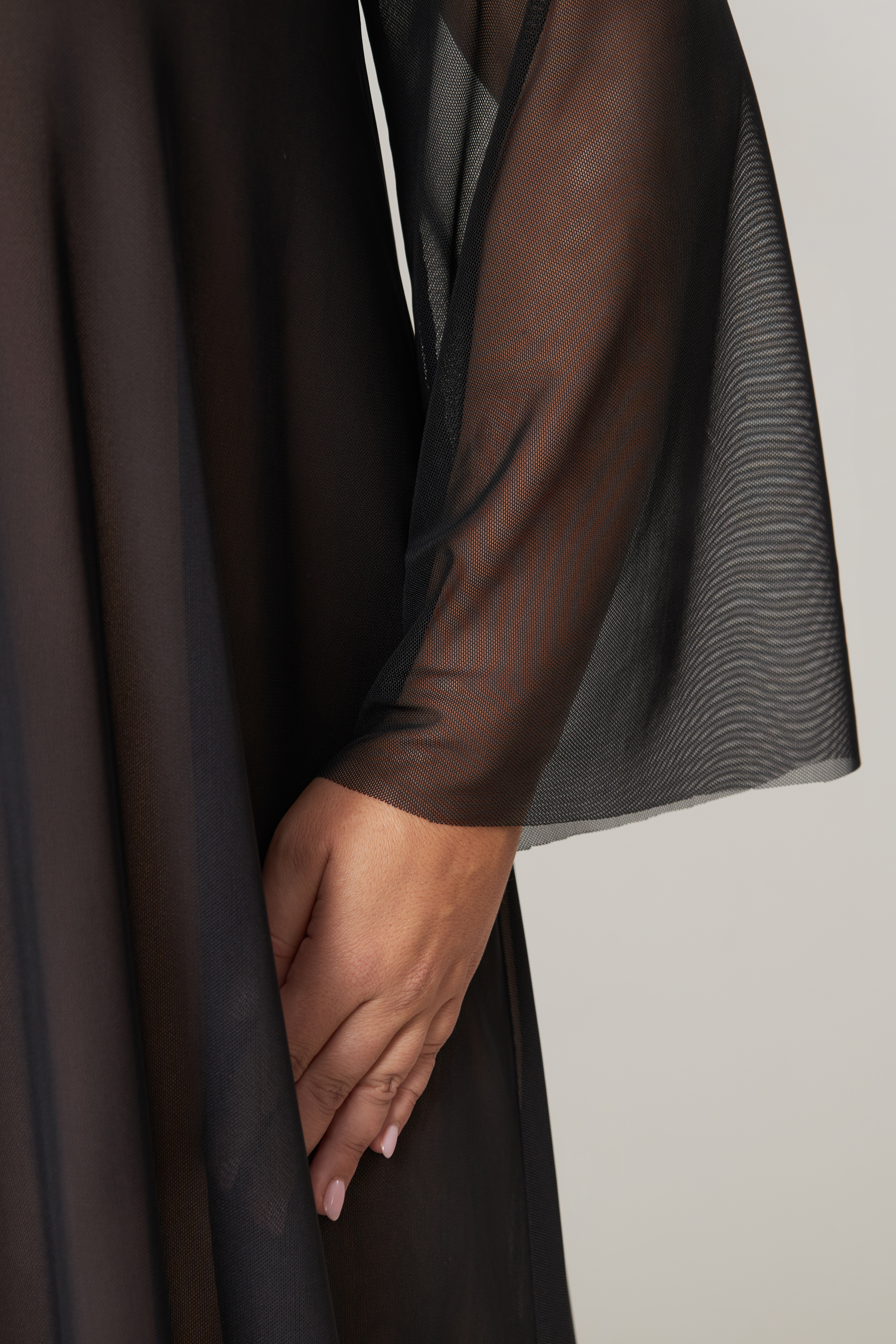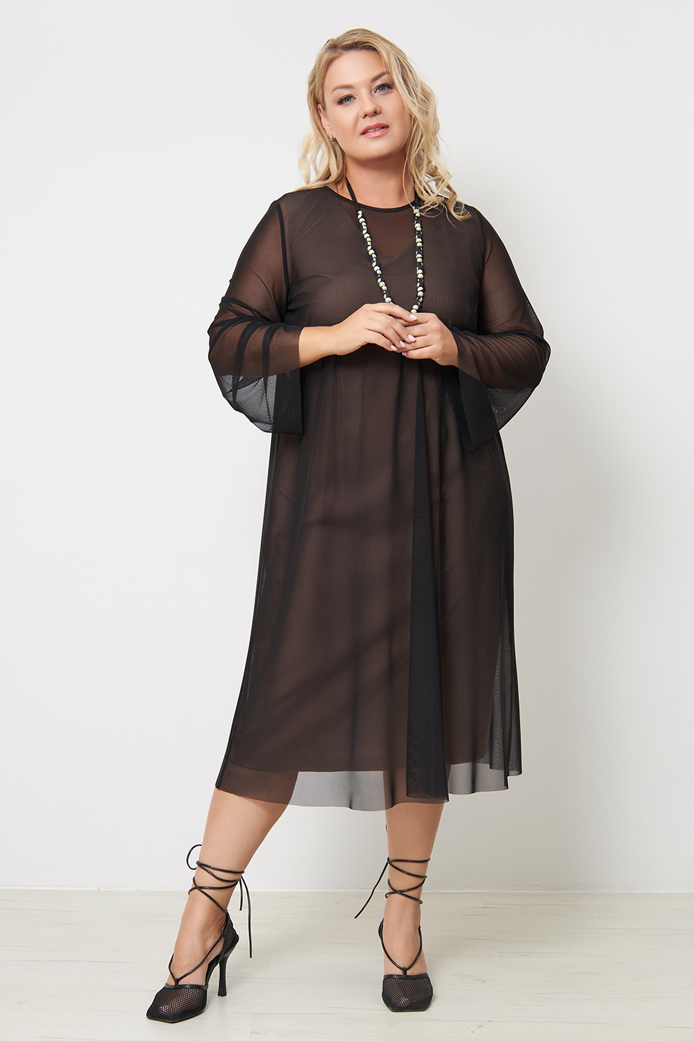 Описание:Платье из сетки А-силуэта, длиной ниже колена. Рукава втачные, длинные, расклешенные к низу.Горловина у платья круглая, обработана окантовкой.
