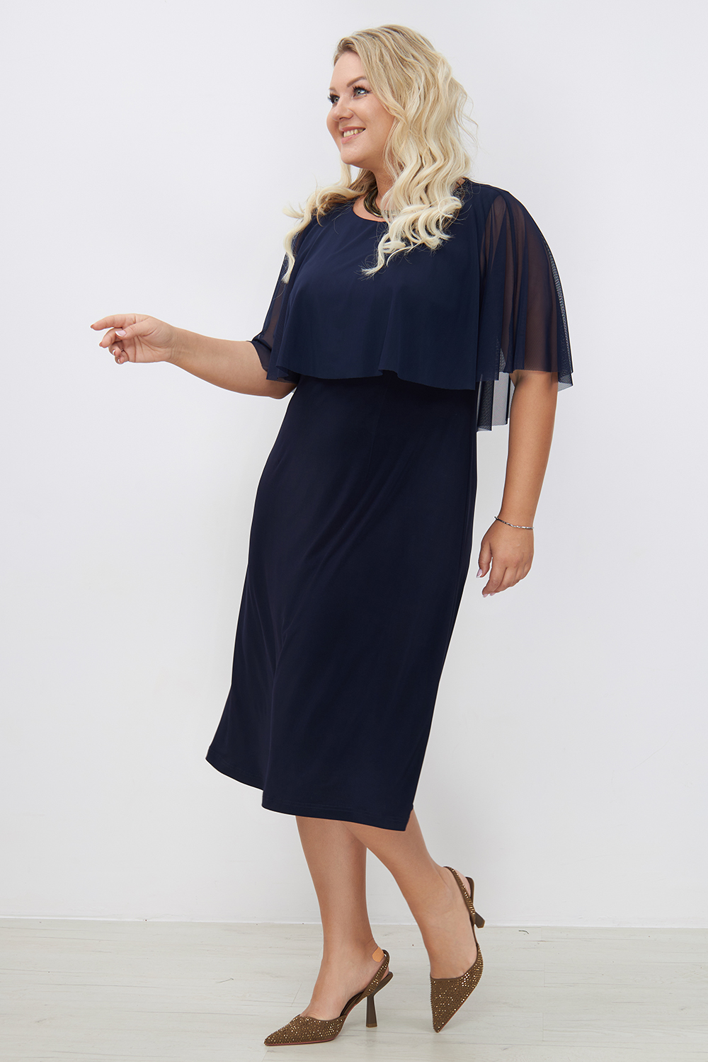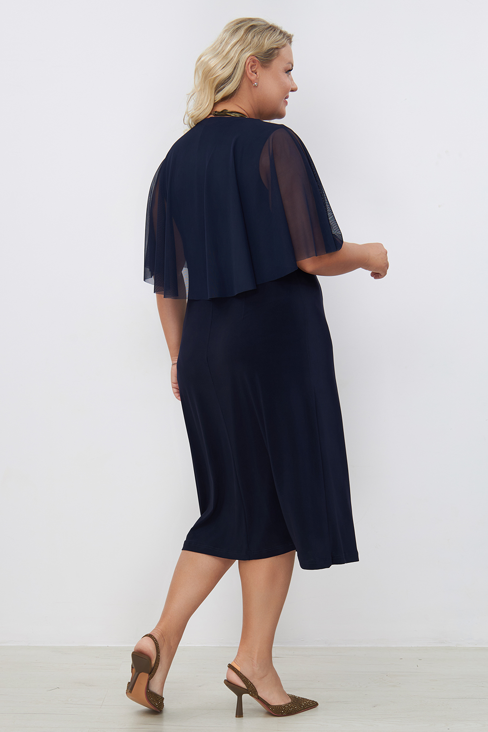 Описание: Платье из тонкого трикотажа приталенного силуэта клешеное к низу с декоративной пелериной из сетки ниспадающей по плечам.