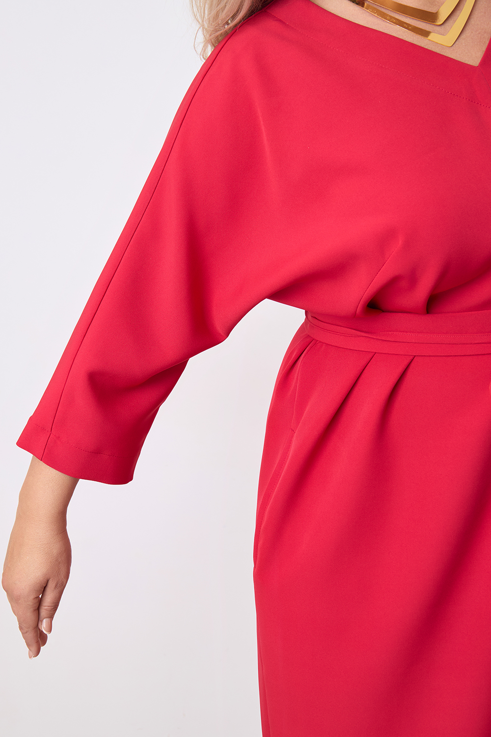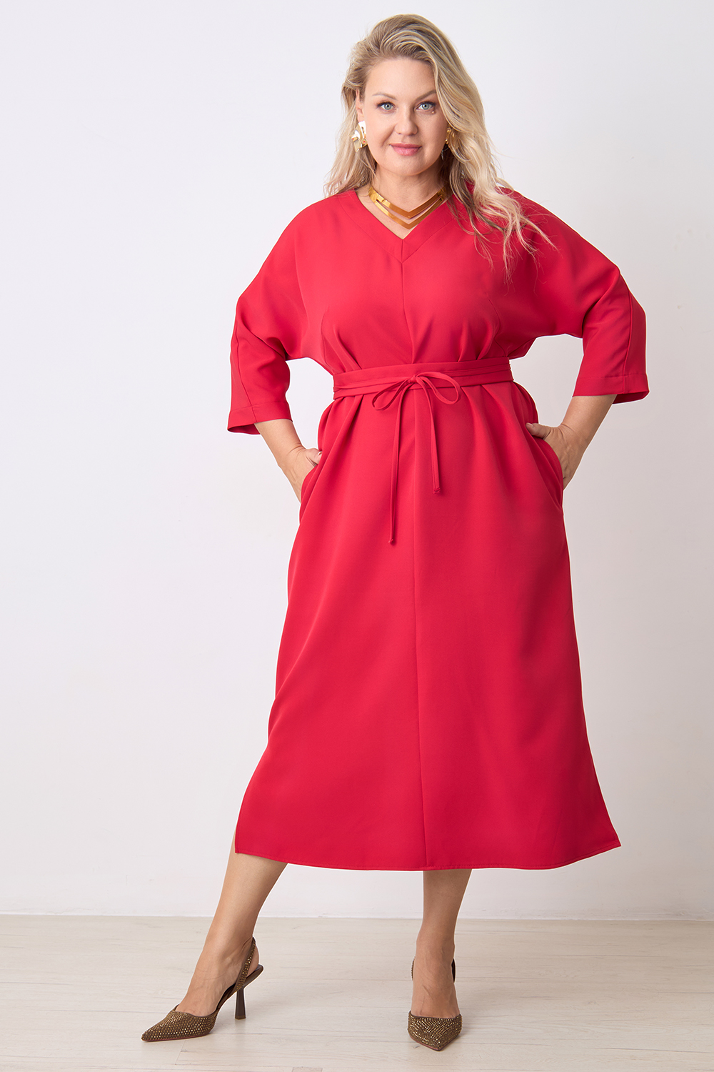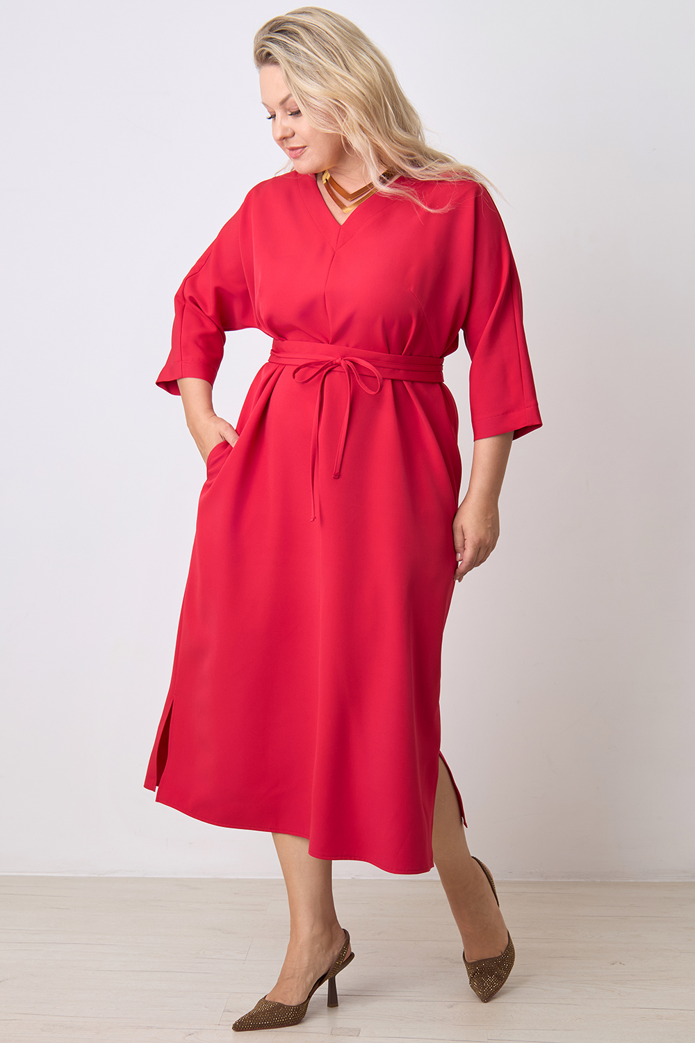 Описание: Платье прямого силуэта с цельнокроенным рукавом длиной 3/4, V- образным вырезом горловины, с декоративным швом по центру переда, карманами в боковых швах и разрезами по бокам с двух сторон. В комплекте фигурный пояс из основной ткани.