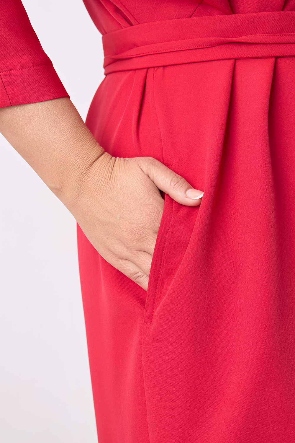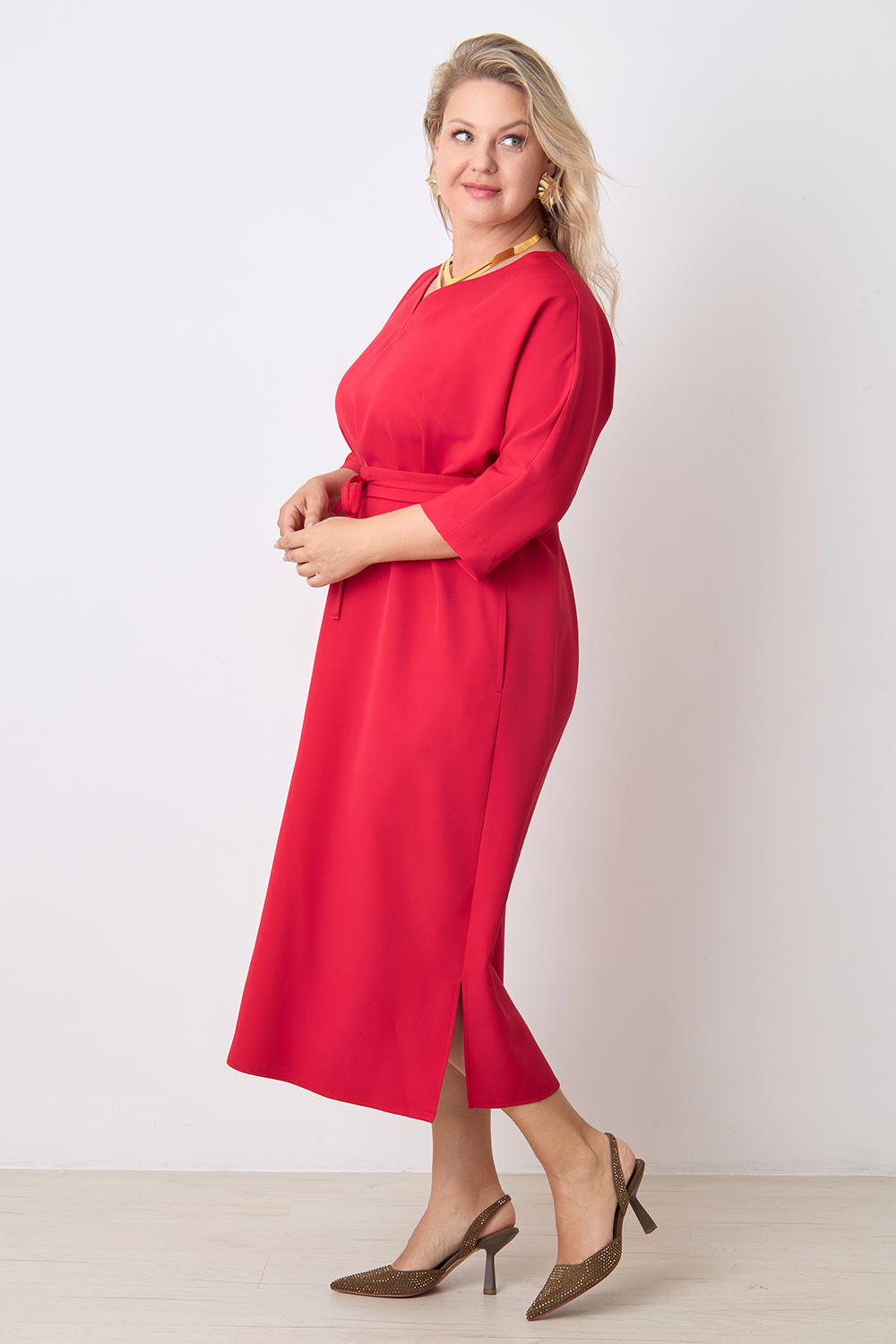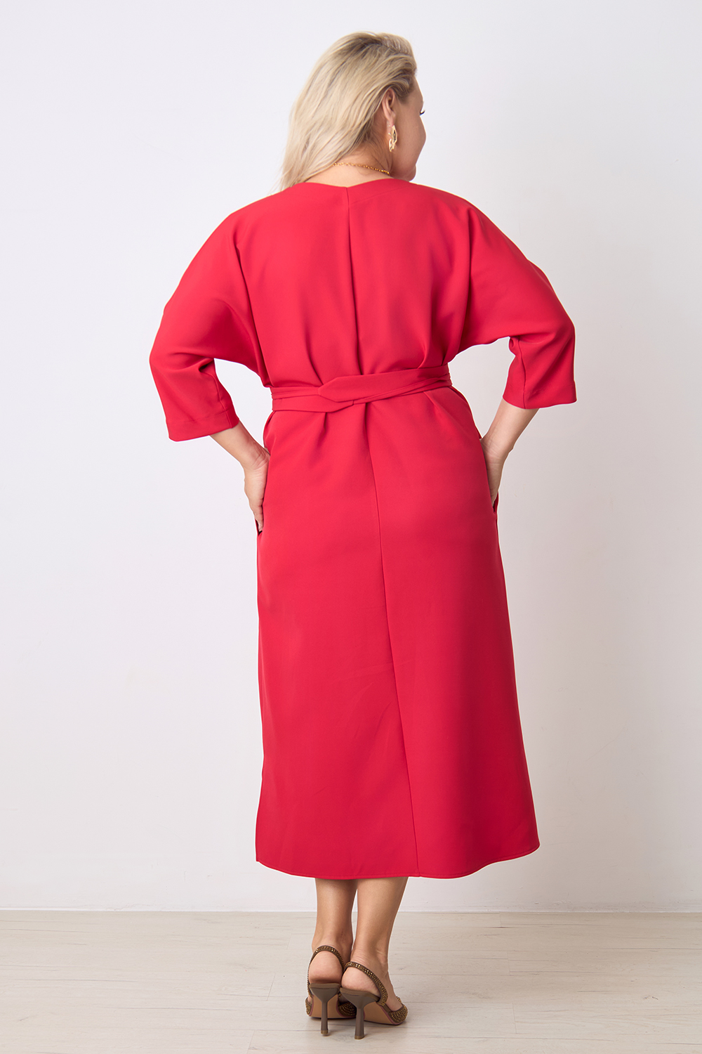 Описание: Платье прямого силуэта с цельнокроенным рукавом длиной 3/4, V- образным вырезом горловины, с декоративным швом по центру переда, карманами в боковых швах и разрезами по бокам с двух сторон. В комплекте фигурный пояс из основной ткани.