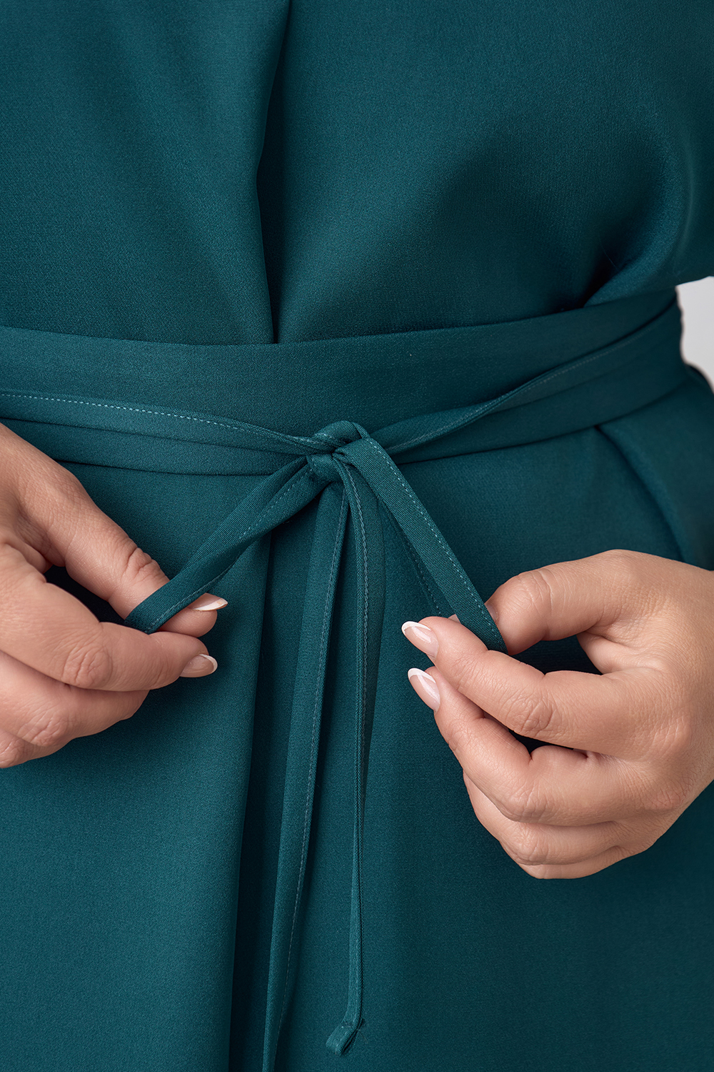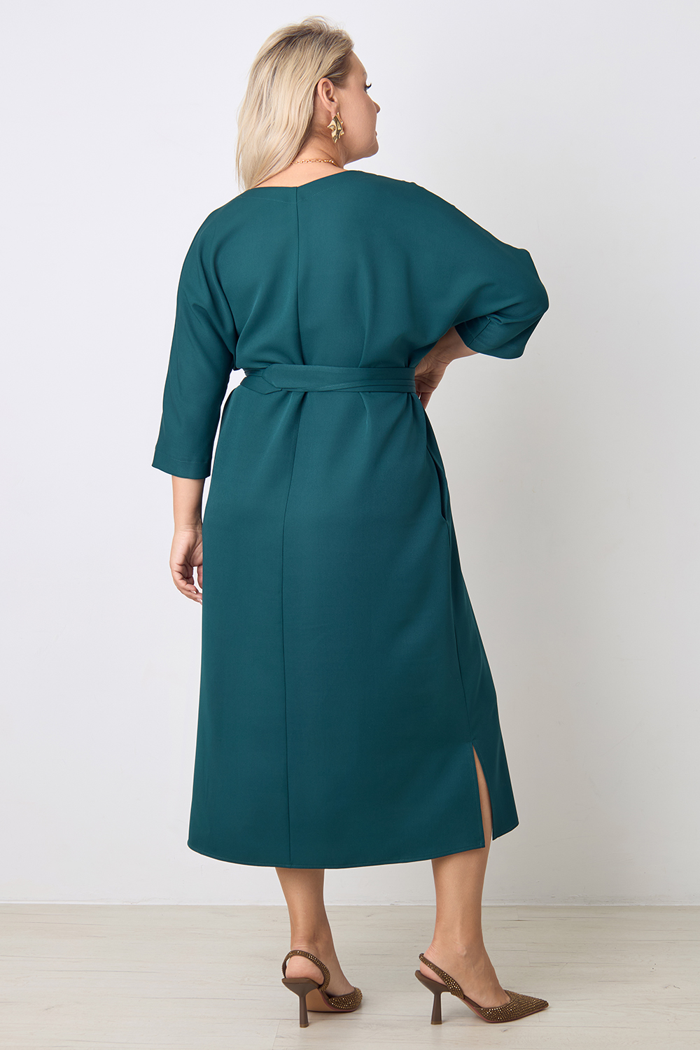 Описание: Платье прямого силуэта с цельнокроенным рукавом длиной 3/4, V- образным вырезом горловины, с декоративным швом по центру переда, карманами в боковых швах и разрезами по бокам с двух сторон. В комплекте фигурный пояс из основной ткани.