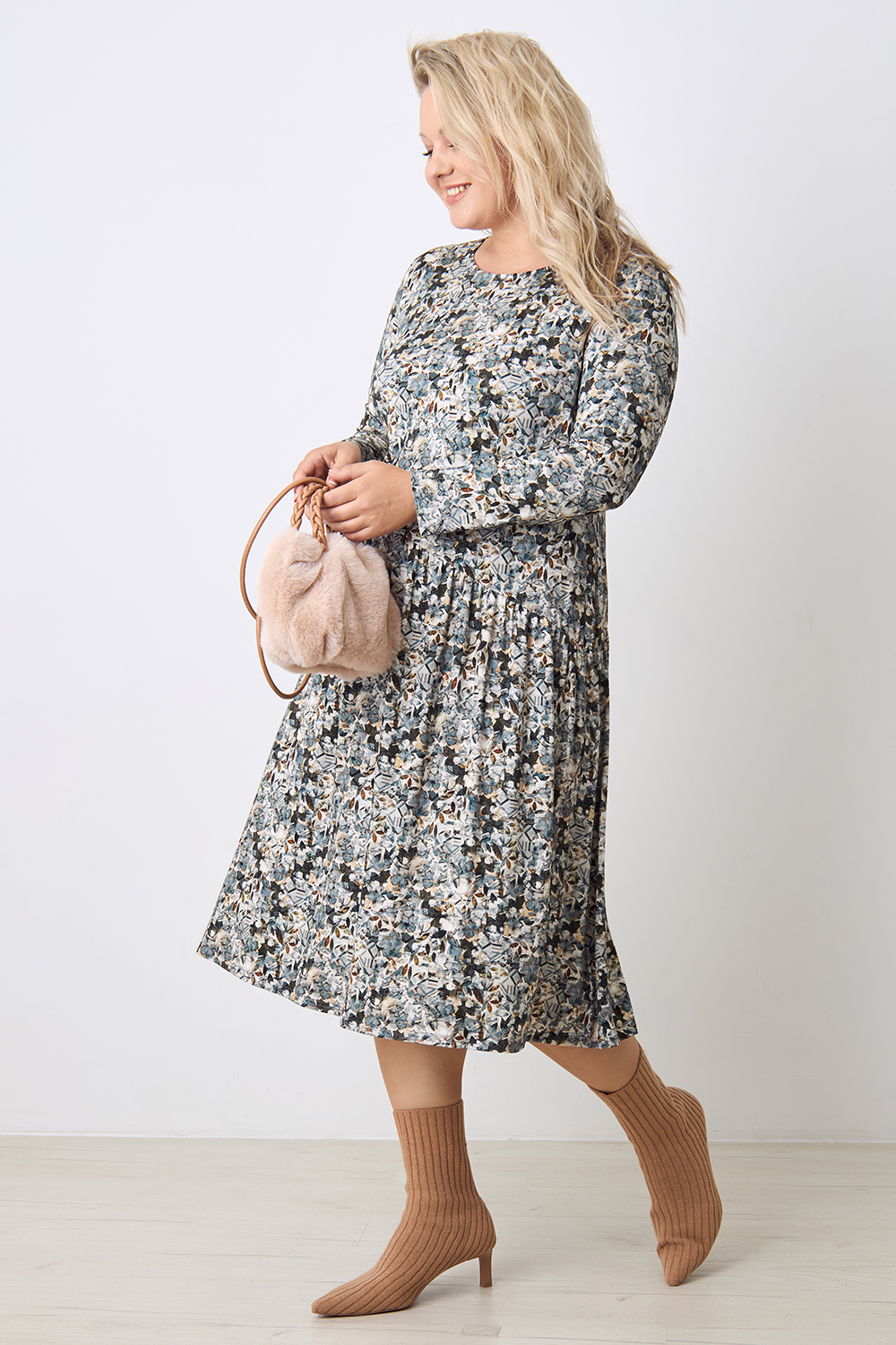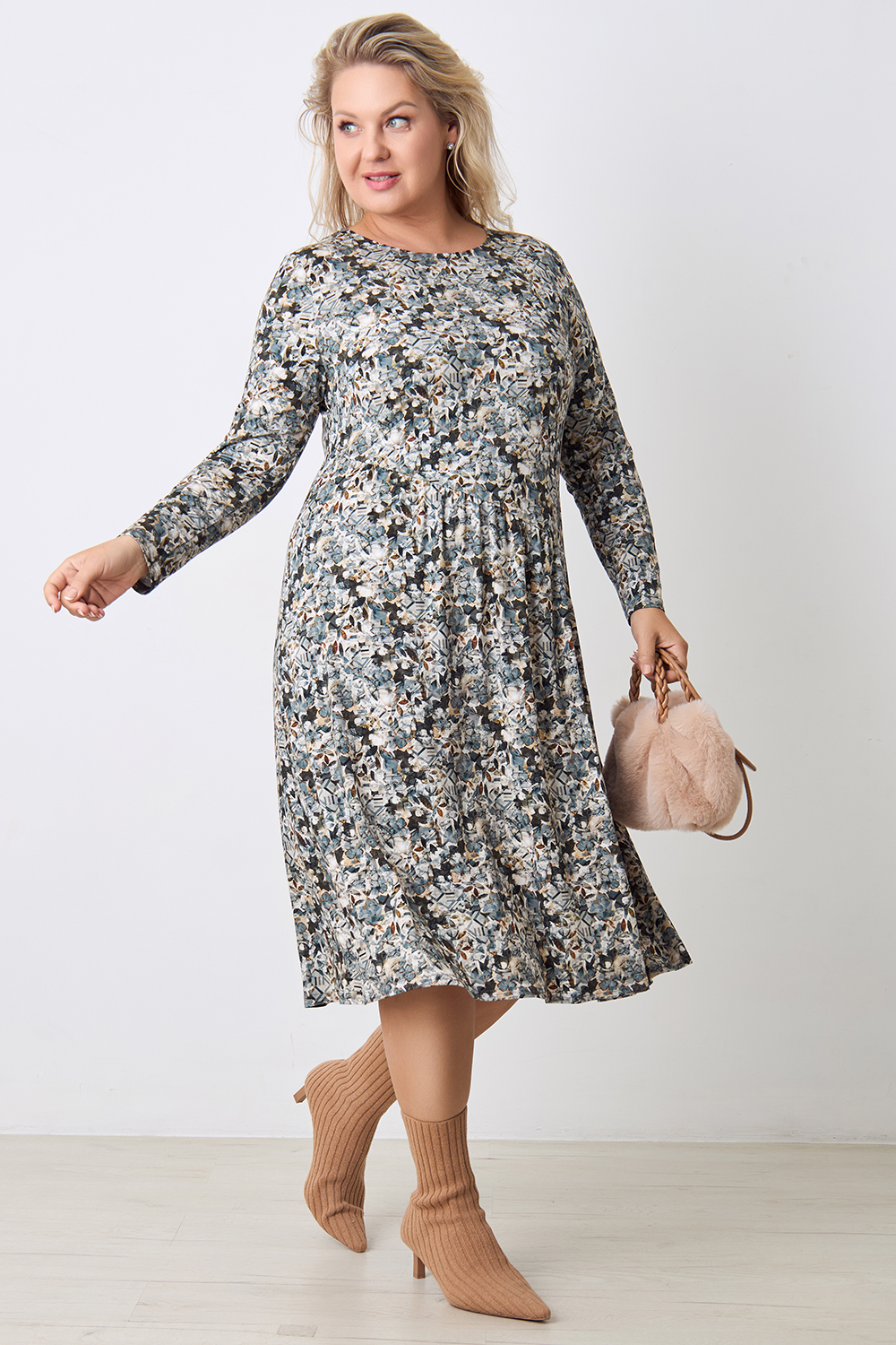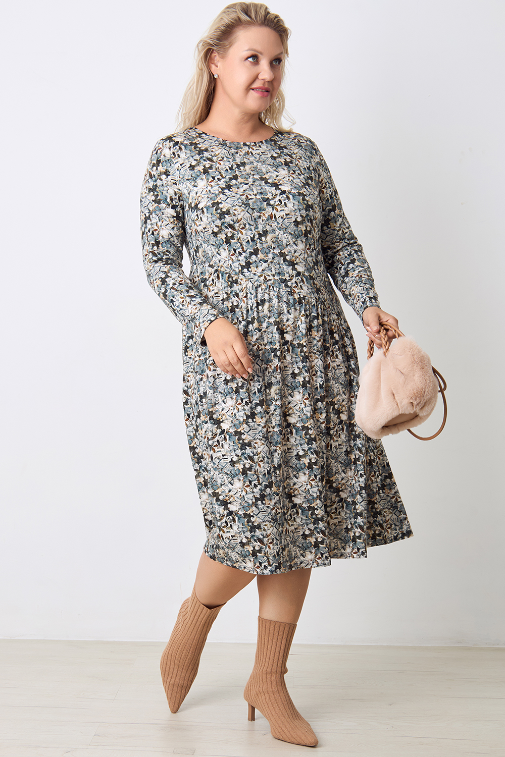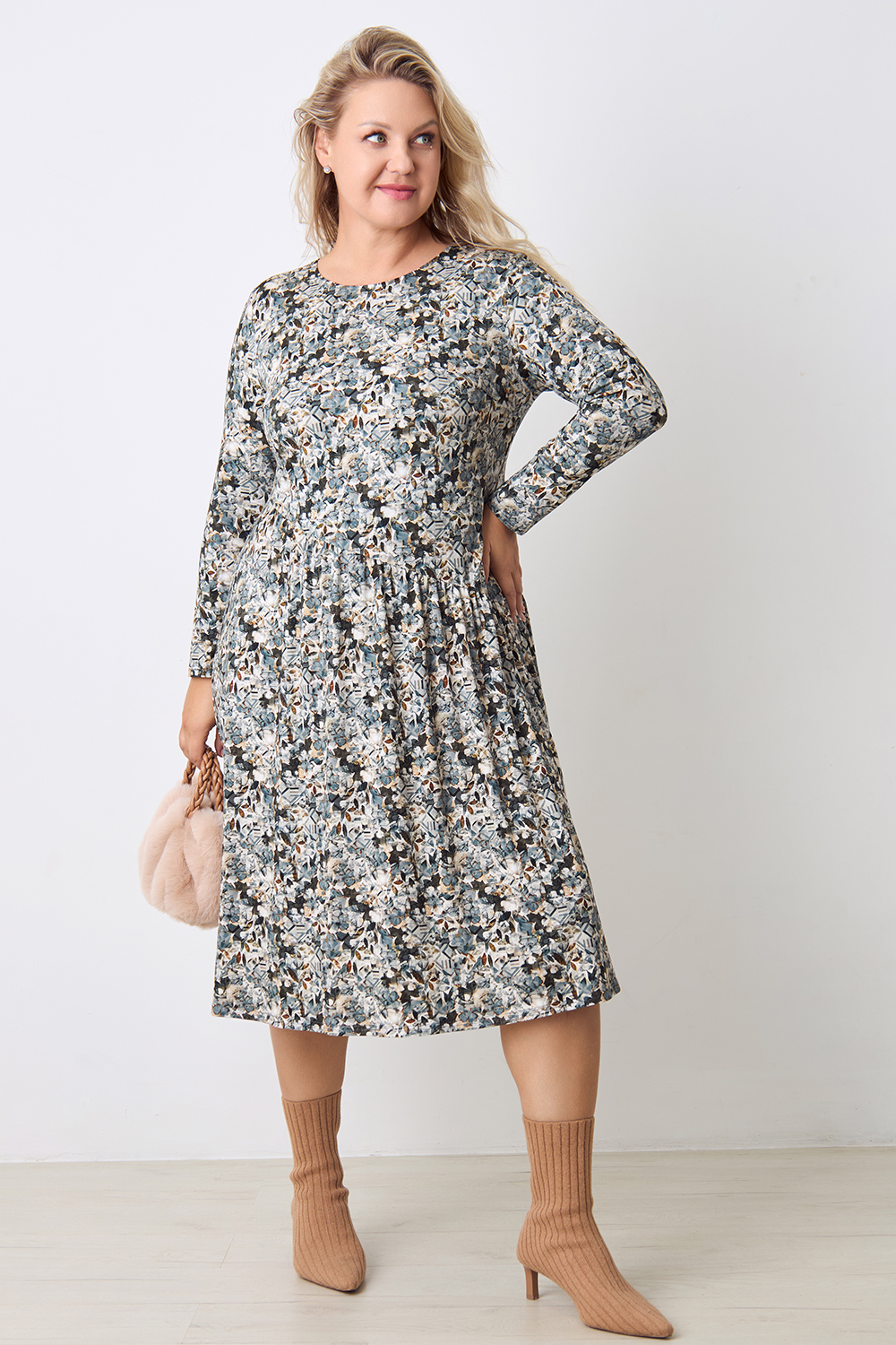 Описание: Платье из тонкого вискозного трикотажа полуприлегающего силуэта с асимметричным подрезом по талии со сборками по нижней части. Вырез горловины округлый, рукава длинные