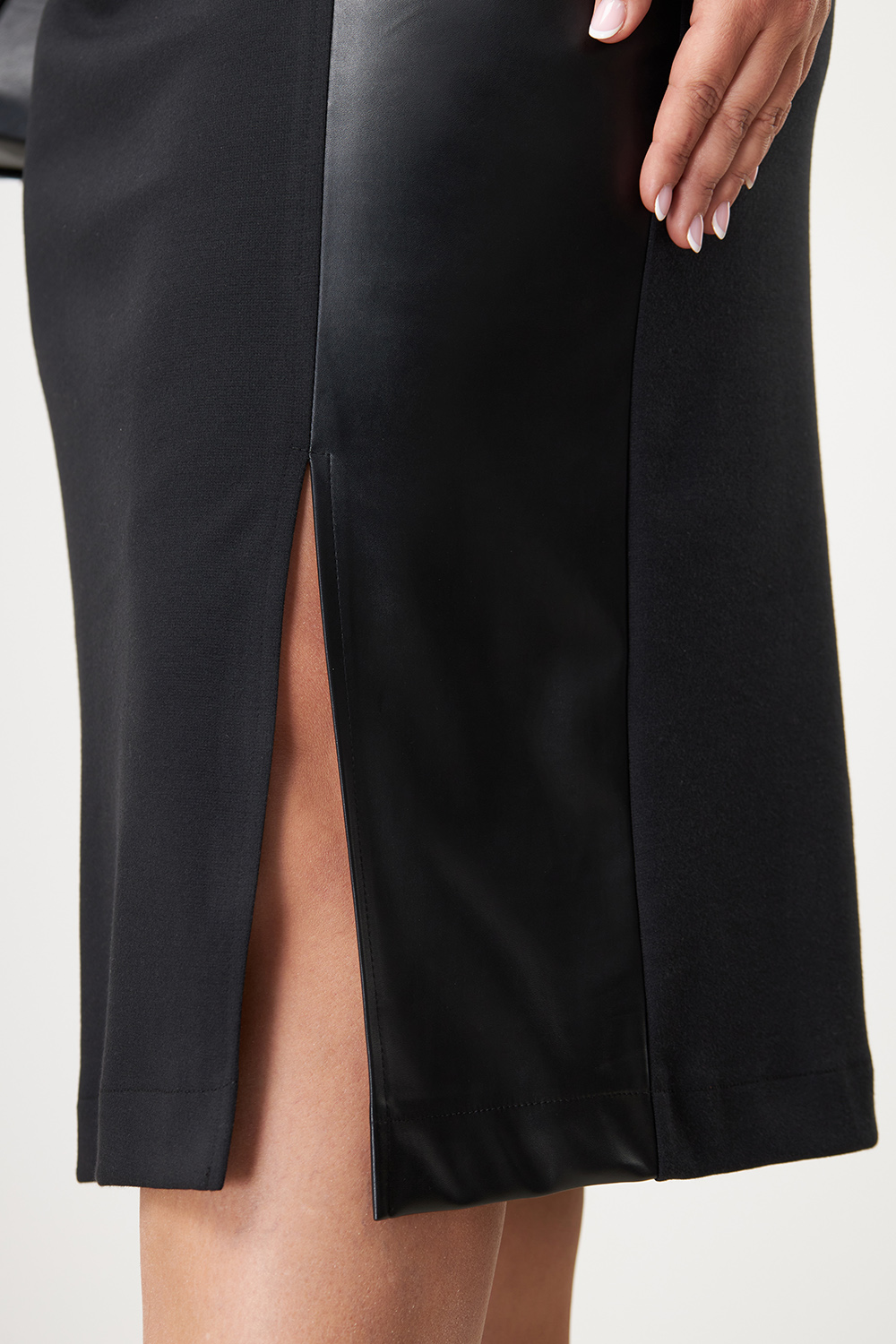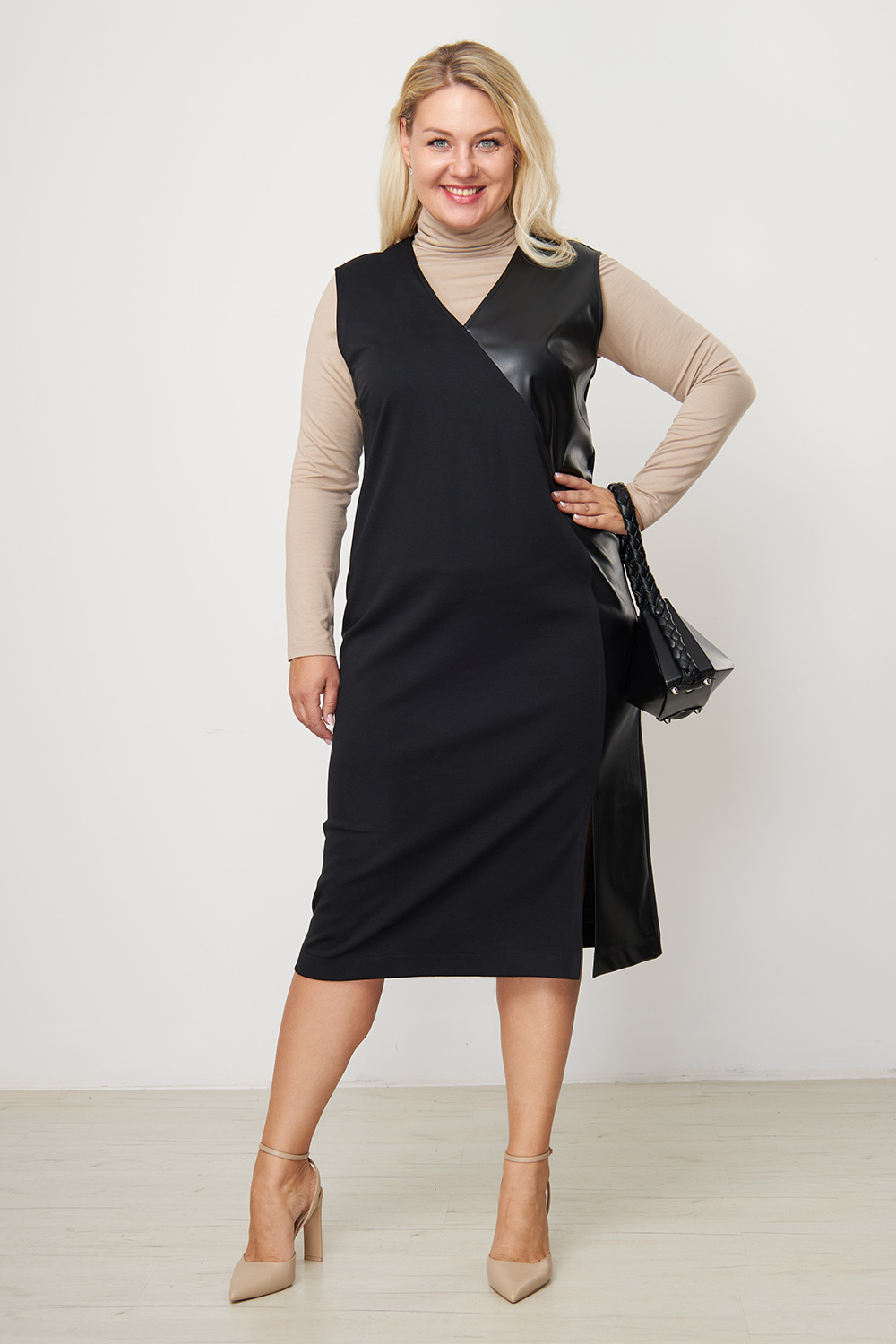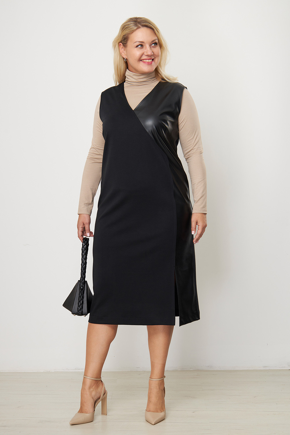 Модель выполнена из плотного трикотажа "джерси" со вставкой из экокожи по боковой части полочки. Обладает прекрасным стройнящим эффектом. Кожаная вставка визуально увеличивает грудь, вытягивает силуэт и усиливает впечатление.